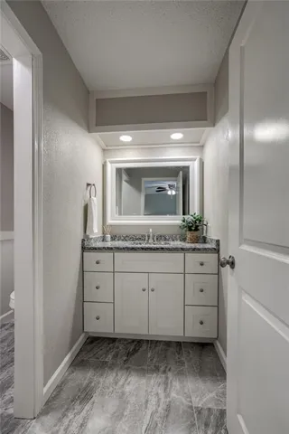 "LongDescription" => "Kitchen with wood finish cabinetry, recessed lighting, freestanding refrigerator, and light stone countertops"