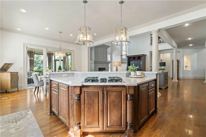 +"PublicRemarks": "Welcome to your dream home on a private street in Wyngate! This gorgeously updated residence features a stunning eat-in kitchen with quartz countertops, stainless appliances, and a walk-in pantry. The two-story great room boasts an updated fireplace, perfect for cozy evenings. The remodeled primary suite offers a luxurious escape with a free-standing tub and statement chandeliers. Upstairs, you'll find three spacious bedrooms with new carpet, and two bathrooms (full and Jack and Jill). The basement is partially finished with a family room and is ready to add a bathroom and bar. The garage includes a workshop, mudroom and epoxy flooring. Enjoy outdoor living on the screened porch with fireplace or on the paver patio with built-in grill surrounded by extensive landscaping. This home is a true gem!"