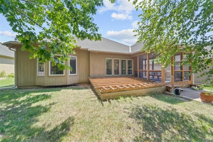 +"PublicRemarks": "Welcome to modernized main level living located in a quiet cul-de-sac, with custom features throughout. Walking through the front door you're greeted with rich hardwood floors and soaring vaulted ceilings - giving a large open layout. Check out the generously sized living room with large windows showcasing the beautiful nature in the backyard. The dining area offers great natural light, which seamlessly connects to a large, screened-in back patio complete with a ceiling fan, giving access to the yard as well. The separated master suite is a true retreat, featuring a luxurious en-suite bathroom with stylish tiled floors, a spacious walk-in closet, and a dual-head tiled shower. The first floor also includes a convenient laundry room, a second full bathroom, and a cozy second bedroom. Descend down the wide staircase to the newly re-finished basement, where you'll find a welcoming fireplace, a versatile office or rec room, full bathroom, and another true bedroom. Additional features include large storage spaces and a walkout covered patio for unique outdoor access. Residents of this small community enjoy access to a neighborhood pool, tennis courts, and a playground. 4720 Meadow View Drive is not just a house—it's a place where you can truly feel at home."