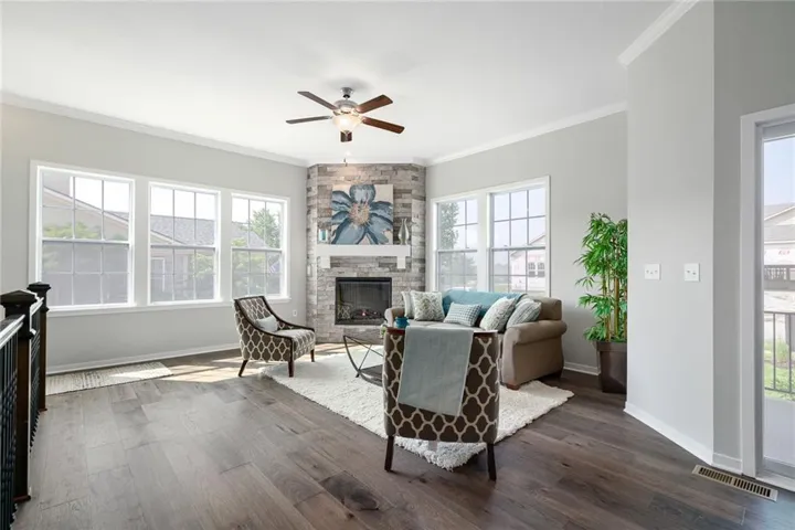 "LongDescription" => "Unfurnished living room with a ceiling fan, a stone fireplace, dark wood-style flooring, a raised ceiling, and ornamental molding"