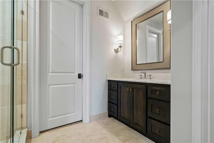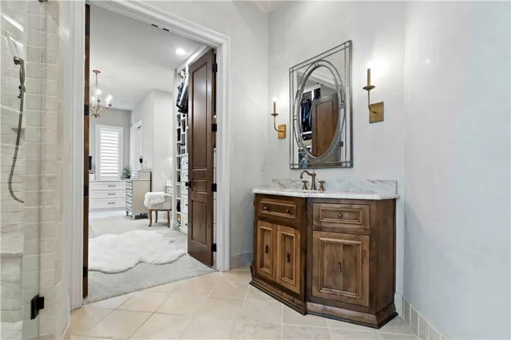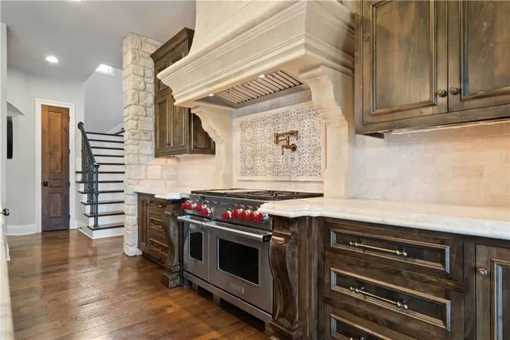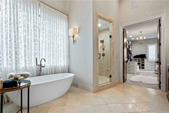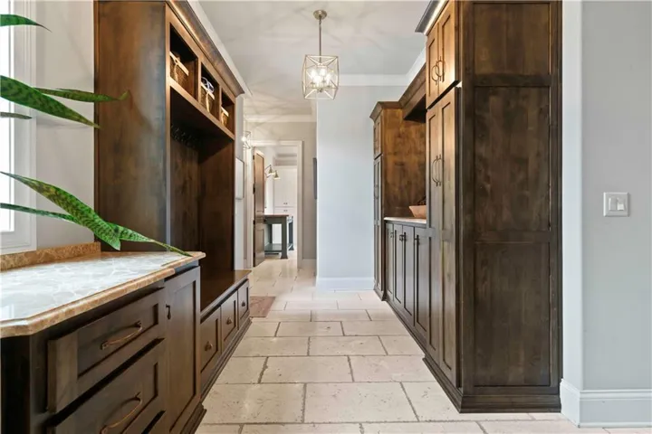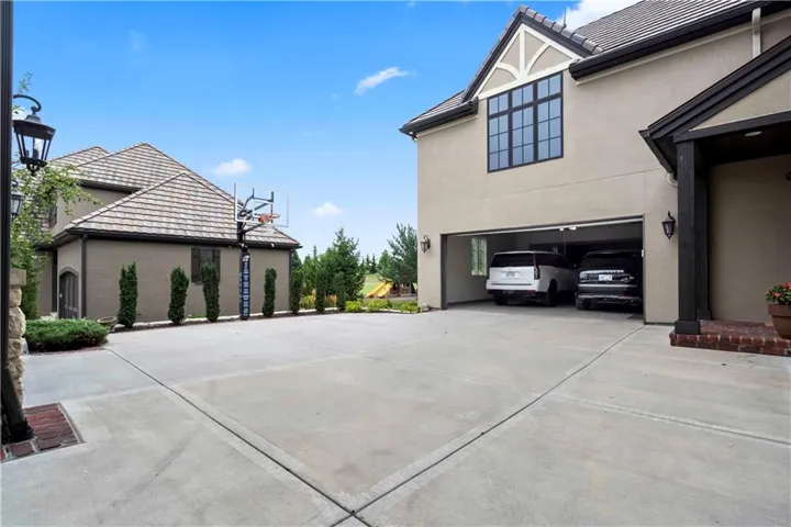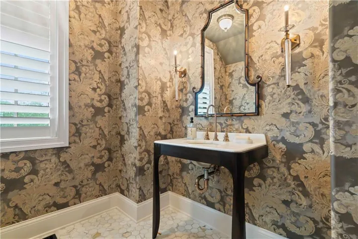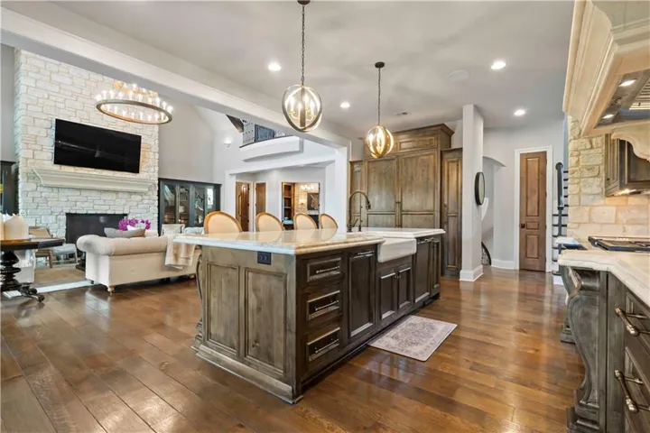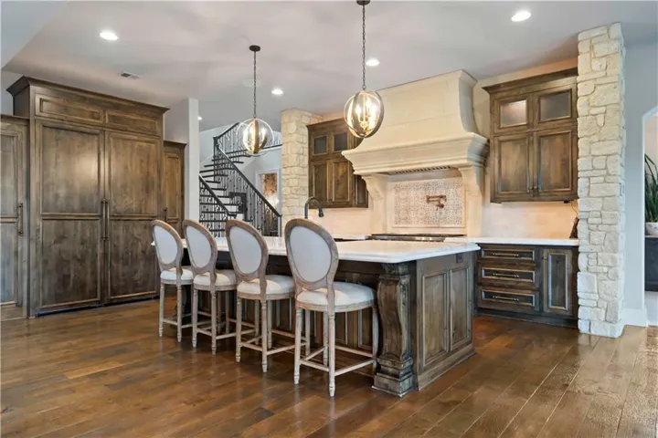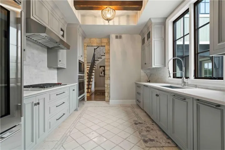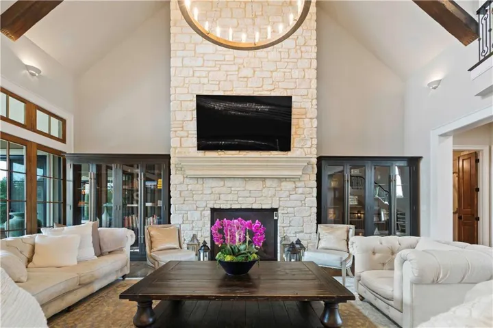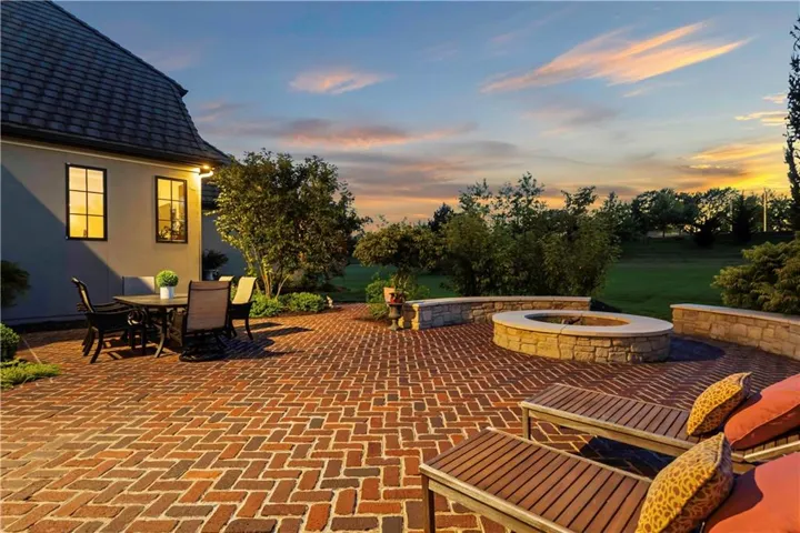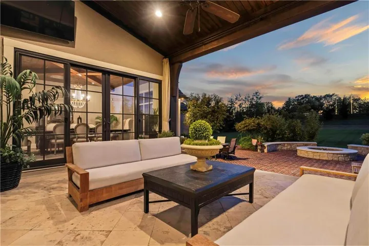 The exterior of this captivating home boasts a stunning façade featuring travertine, stone, and over 100-year-old reclaimed brick accents. A grand porte cochère welcomes you to a motor court & garages. The covered back patio, complete with a built-in firepit & seating wall, is perfect for outdoor gatherings & tranquil evenings.\r\n