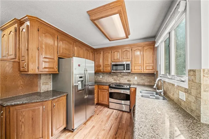 "LongDescription" => "Kitchen with stainless steel appliances, backsplash, light countertops, brown cabinetry, and a textured ceiling"