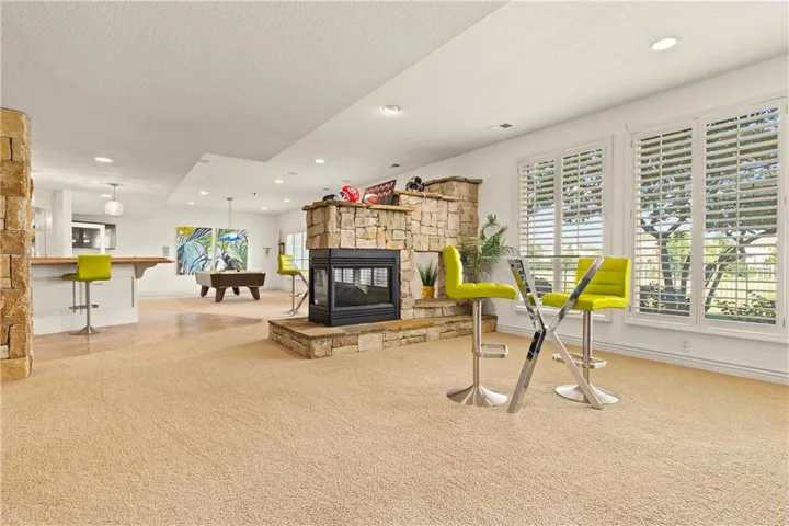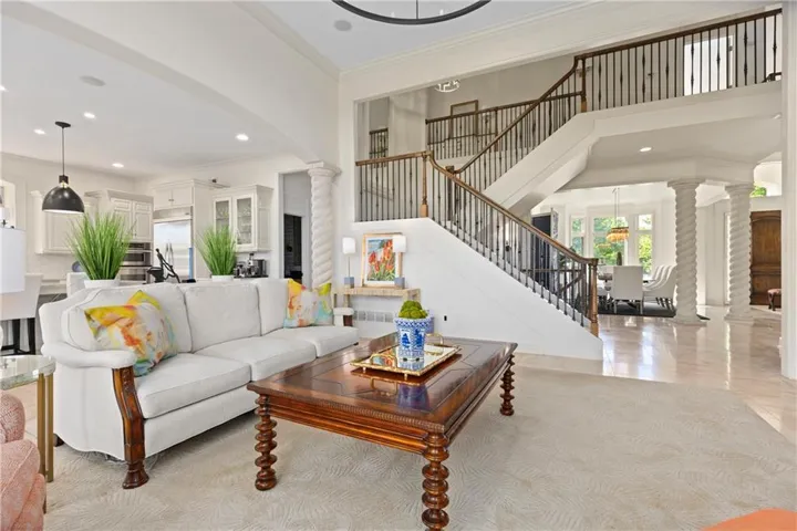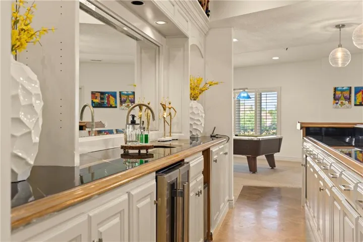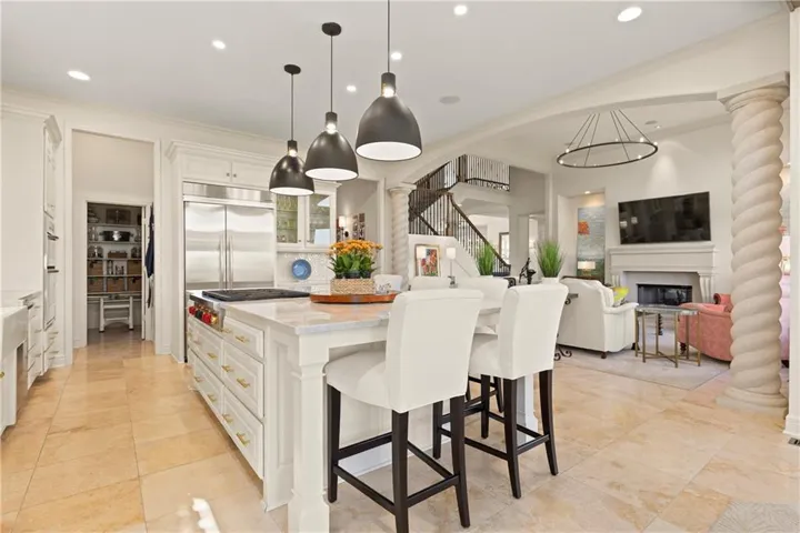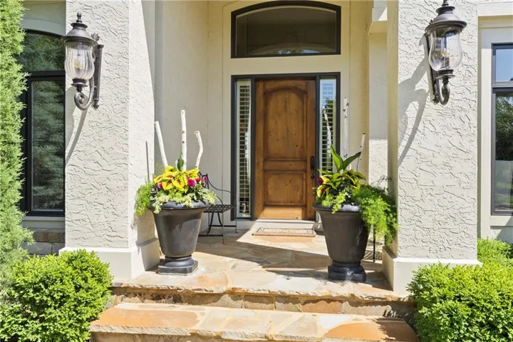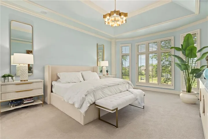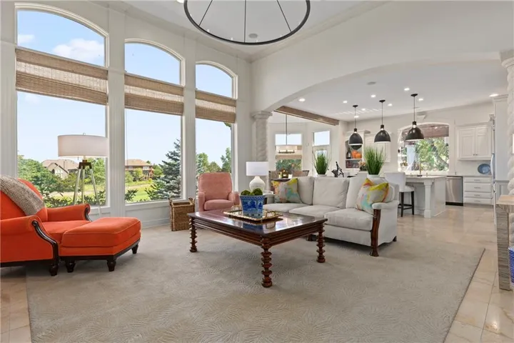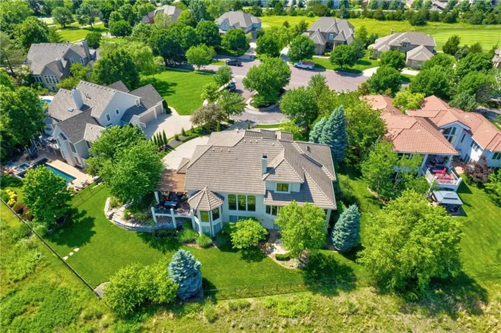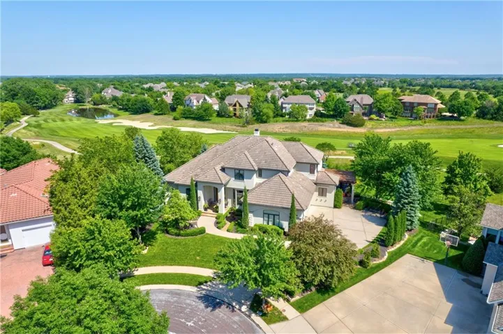 Unparalleled views of the entire 16th hole, from the lakeside tee boxes to the green through the floor-to-ceiling windows. This stunning and graceful home, located on one of the most exclusive cul de sacs in the prestigious Links of Lionsgate, features a fully interior and east-backing lot, with no south or west sun, and is fully insulated from apartments, busy streets, traffic noise, and lights. The home offers abundant natural light, illuminating the elegant living spaces with timeless charm, and day-to-day living, and perfect for entertaining! Truly an entertainer’s dream, it can easily host 100 plus on the open first floor and the lower level—with its 16’ bar—for Chiefs watch parties, showers, and whatever your heart pleases The updated open gourmet kitchen with luxurious countertops, custom cabinets, breakfast nook, and pantry is a chef’s dream! Adjacent hearth room is ideal for unwinding by the fireplace. Enjoy peaceful surroundings and Al Fresco dining while watching your friends tee off next to a lake, navigate the fairway, and putt out across from your deck conveniently connected to the fabulous butler's kitchen with an additional oven and a 2nd dishwasher. Retreat to the primary suite featuring a lavish bathroom with two walk-in closets. The upper level boasts 3 generously sized bedroom suites with private baths + walk-in closets plus a bonus loft. Massive pie-shaped lot with expansive golf course footage, primed and waiting for whatever outdoor fun you love—volleyball, soccer, and whatever pool your heart desires!
