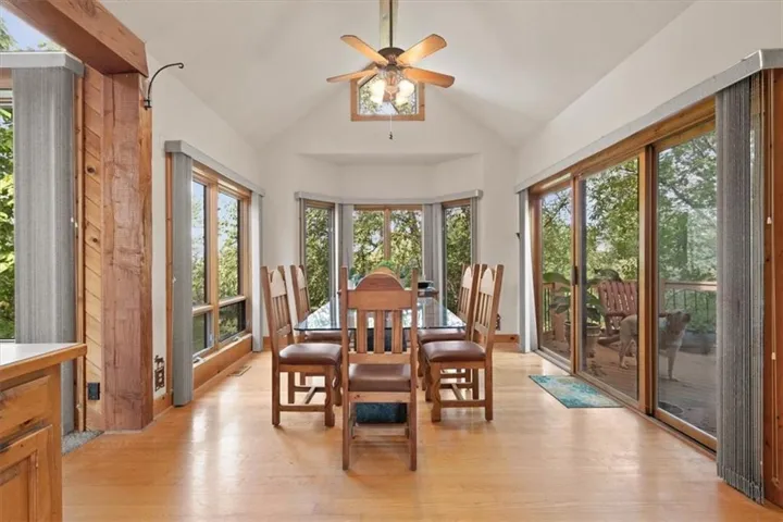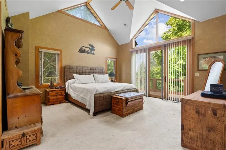 The entry is grand with a pine vaulted ceiling. Floor-to-ceiling windows and a stone fireplace. Opens up to the 2nd story loft area. large cedar closet, 2 bedrooms with vaulted ceilings, walkin closets and a shared jack-and-jill bathroom. Formal dining room and big kitchen with additional dining/breakfast area. A second deck off the kitchen is perfect for relaxing, entertaining and grilling and offers shade.\r\n
