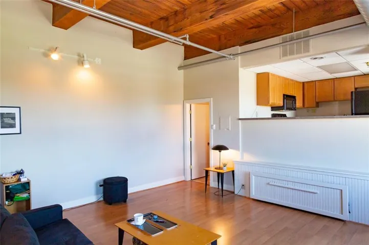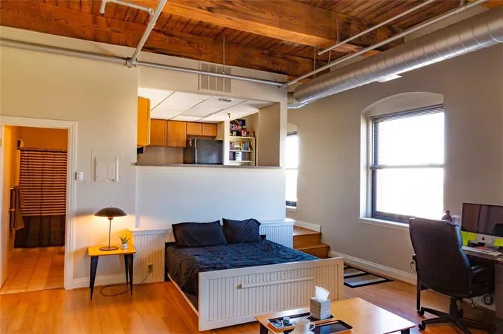 HIGHLY SECURED BUILDINGS, PARKING and OUTDOOR AREAS. Condo features Soaring Windows with Expansive View, Beamed Wood Ceilings, Large living area with a queen bed frame that stows away under the kitchen. Kitchen complete with modern appliances. Easy Access to Highways, Downtown, The Streetcar, River/City Market, Restaurants, shops and much more. You won't be lacking in Amenities which include Two Gyms, Sauna, Hot Tub, Theater Room, Outdoor Pool and Entertainment area. Outdoor areas complete with gas grills for outdoor dining. Both buildings have areas for social gatherings. Surface level secure, assigned parking off Central St w/opener. 1 yr old heating & cooling unit. Wired for Google Fiber.