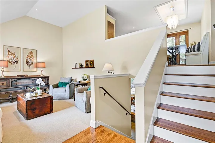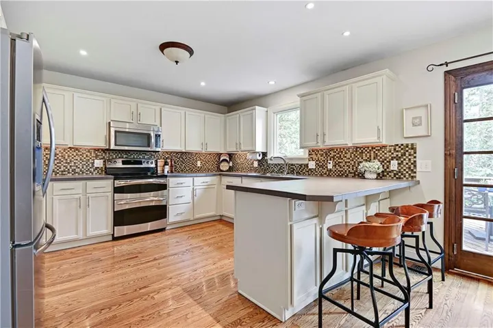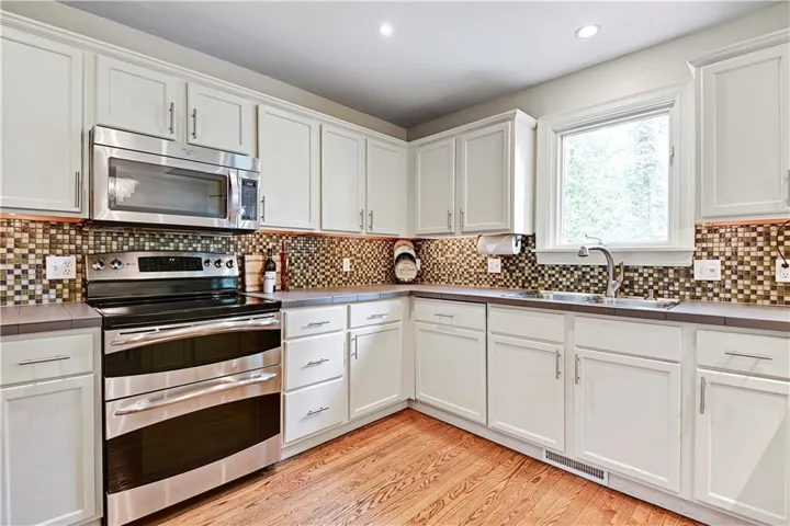 The main level unfolds into a bright, open living space, featuring white oak hardwood floors and a fresh, modern color palette. The kitchen showcasing sleek painted cabinets with pullout trashcan, abundant counter space, stainless steel appliances, double oven, a cabinet-face dishwasher, and a generous eat-in dining area.\r\n