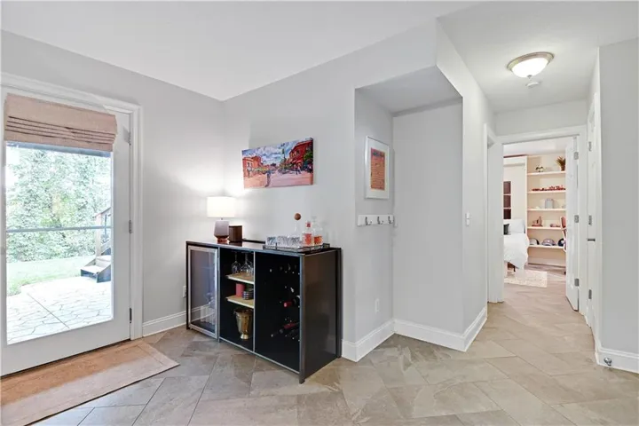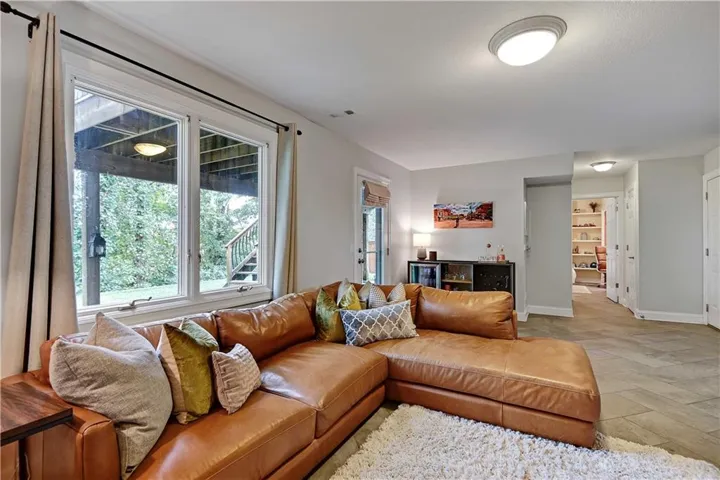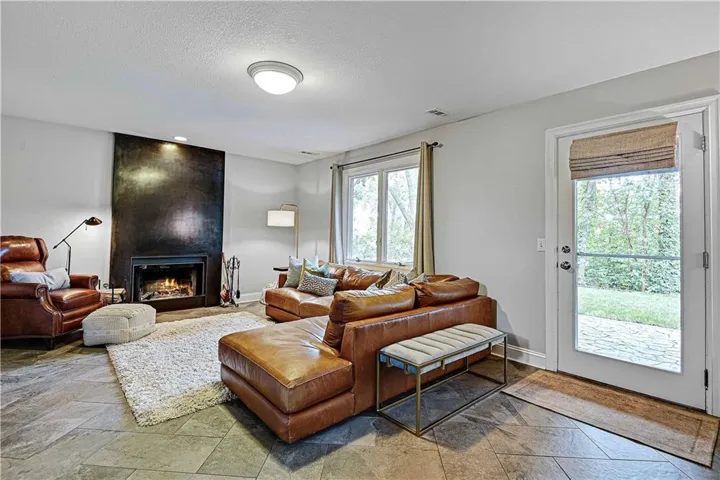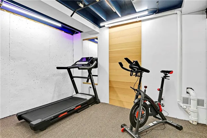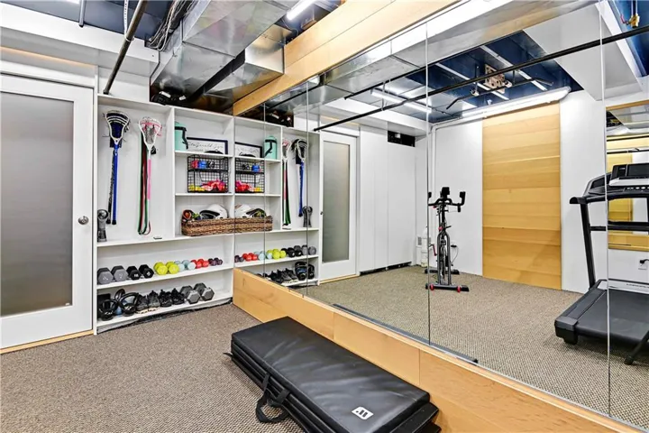 The walk-out lower level features stunning herringbone slate tile flooring, a cozy entertainment area with a steel facade fireplace, a bedroom with a built-in desk area, and a full bathroom. Discover the hidden gem—a custom-made secret door/shelf leading to a private gym.\r\n
