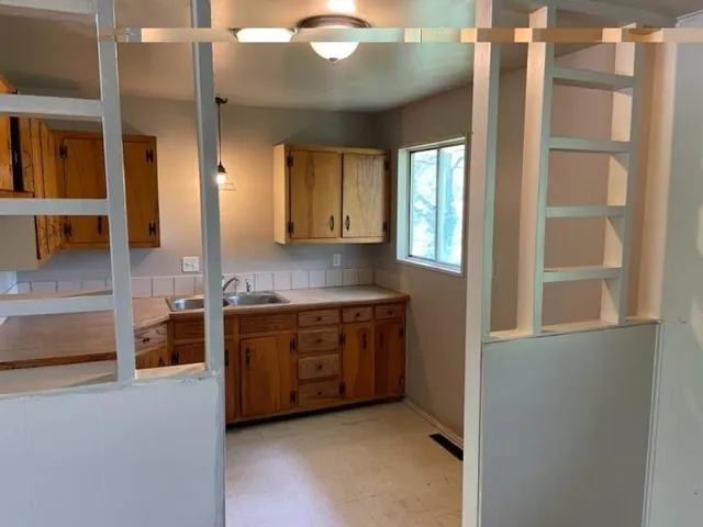"LongDescription" => "Kitchen with green cabinets, open shelves, tasteful backsplash, and light stone countertops"