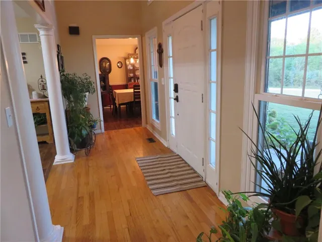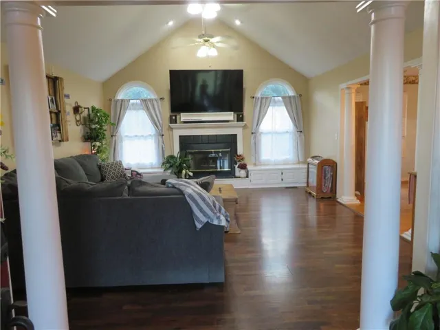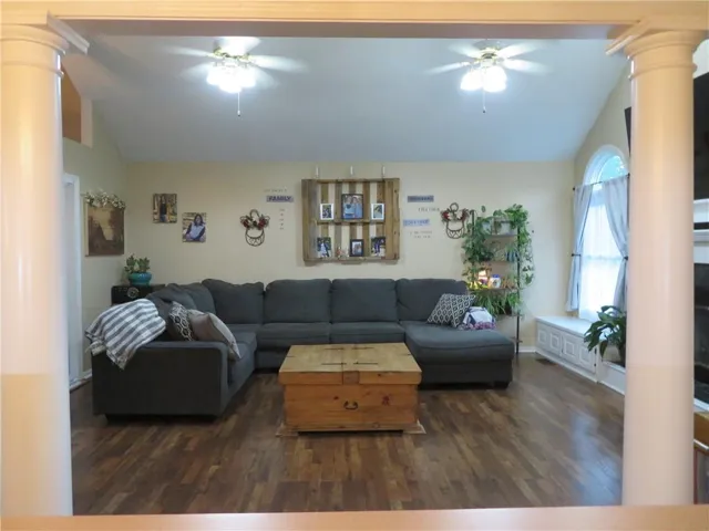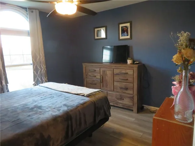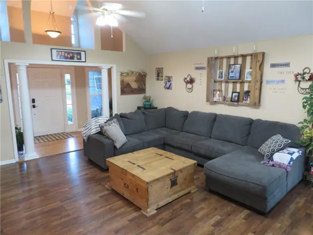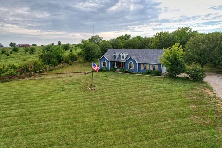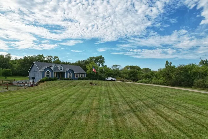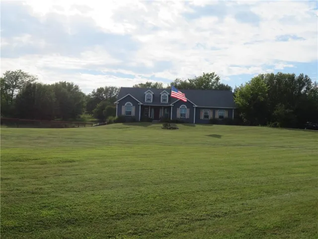 +"PublicRemarks": "Beautiful country ranch home on almost 10+/- acres. This home has a lovely entry, living room with vaulted ceilings & gas fireplace, formal dining and fabulous kitchen (all appliances stay). Main level primary suite with walk-in closet, huge bathroom, jetted tub & shower. 2 more bedrooms on main level and full hall bath, patio for entertaining area off kitchen. Full finished walkout basement is amazing! Huge family/rec room with wet bar area, 1 bedroom, gym can be 5th non-conforming bedroom, laundry room & tons of storage. Walk onto the 2nd patio with fenced area for pets, all newer windows. Small barn & chicken coop. Super location and paved road frontage."