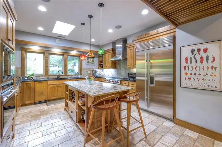 +"PublicRemarks": "Beautifully renovated home in coveted Blue Hills. Approach the covered front entry via stamped concrete drive/walkway past a tranquil fountain and gorgeous Mahogany front doors w/ glass side lights. Vaulted foyer - ceilings were lifted to create open concept feeling throughout the stunning 1st level. Charm of original w/ modern functionality. Renovated kitchen w/ all lighted cabinetry & nesting drawers. Work triangle w/stainless apron sink & pull down goose neck faucet connected to cozy hearth room w/ brick fireplace. Counter seating. Sleek bar area w/ stone countertop & sink, wine fridge & ice maker. Dining room has floor to ceiling bay windows that add to light and airy feeling w/ custom window treatments. Living room leads to backyard. Large office with French doors. Pergola covered patio w/ brick fireplace + TV, built in 4 gas burner stainless Bull Grill. French drains & tiles collect rain water & recycles to feed the relaxing koi pond/water feature & incredible low maintenance landscape that wraps around the fence line. Garage is fabulous w/new scored concrete floor corrugated metal wainscoting, speakers & mounted TV! Powder room is spacious & beautifully appointed & flanked in build-ins for the perfect drop zone/mud room and walk in pantry. Spacious and modern bedrooms w/ huge closets. Every bathroom has been fitted with new tile, heated floors, cabintry, toilets and fixtures. A fireplace anchors the expansive primary suit, boasting a spa-like bathroom w/zero-depth shower, soaker tub, heated tile floors, marble double vanity & private commode. Wonderful laundry room within the primary walk in closet. Light, bright loft with skylights make an amazing office/flex space! Amazing Smart Home Integration including garage opener & Honeywell thermostats for seamless app-based control for max efficiency. HVAC is zoned, newer thermal Windows & Doors, Tankless Water Heater & Central Vac have been added. Truly not one thing to do but move in and ENJOY!!"