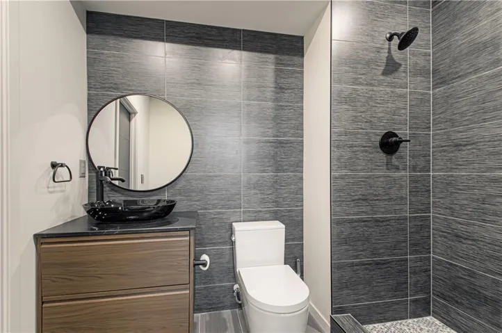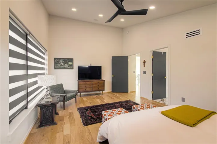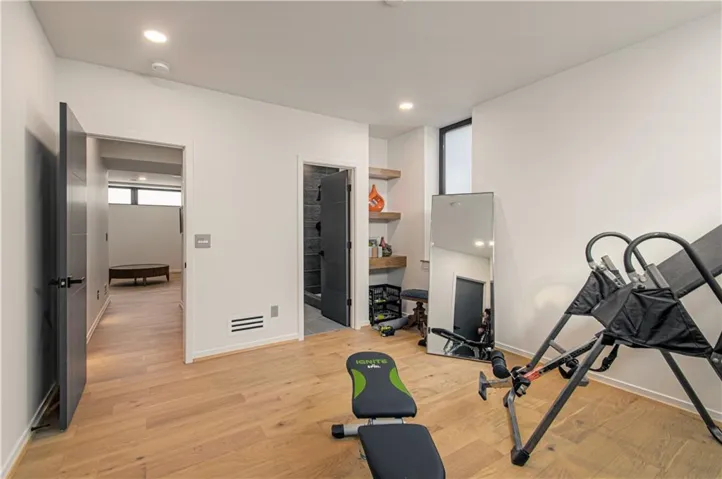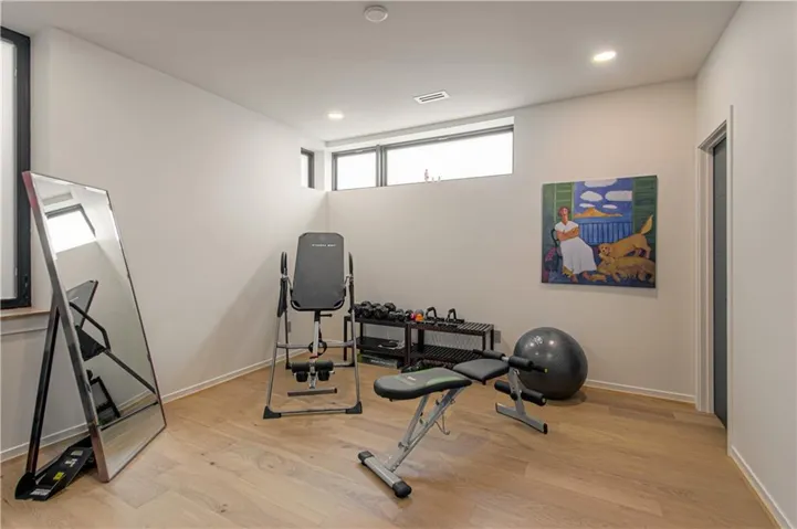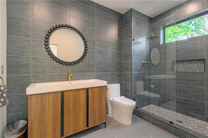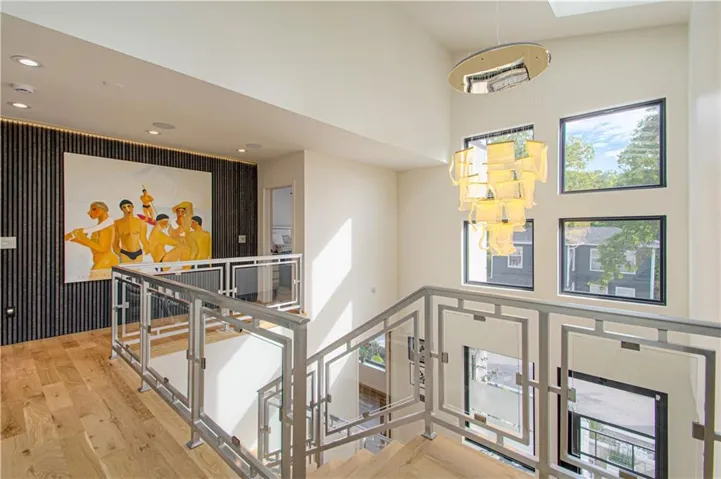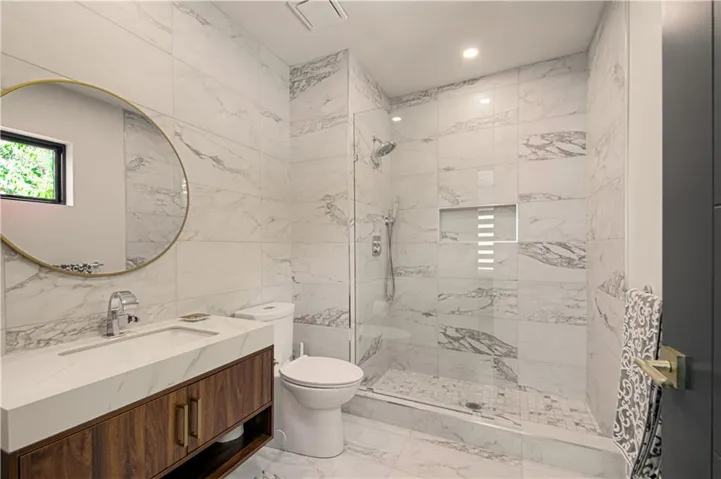 and Thermador built in refrigerator and freezer along a 16 foot wall of tall pantry cabinets . Additional storage in the walk in pantry. Additional formal dining room with acoustic wood wall and large floor to ceiling windows. First floor also offers a den/bedroom with a full bath. Second floor has a laundry room, three additional bedrooms with en-suite bathrooms. The primary bath with large porcelain clad walls and heated floors, huge shower in addition to an ample primary walk in closet.\r\n