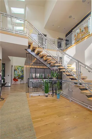 Going across the front to the back of the house. The atrium filled with a steel floating staircase accented at night with LED\r\n