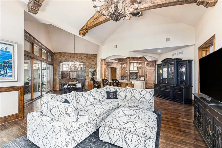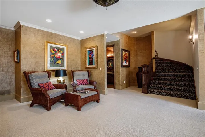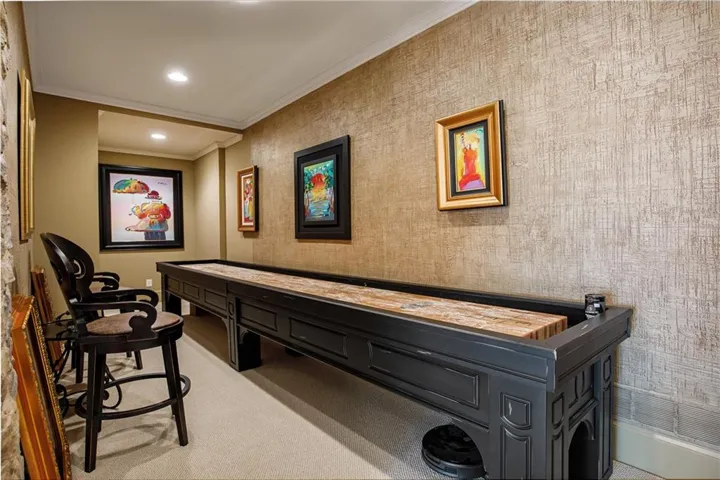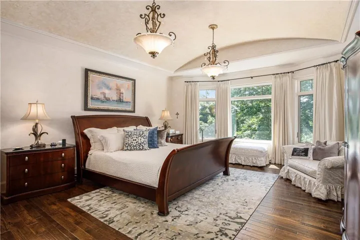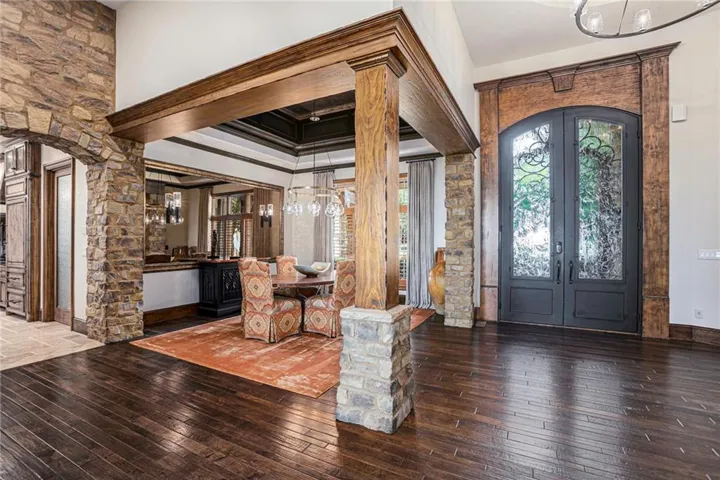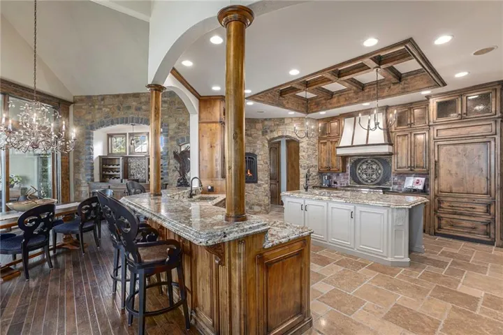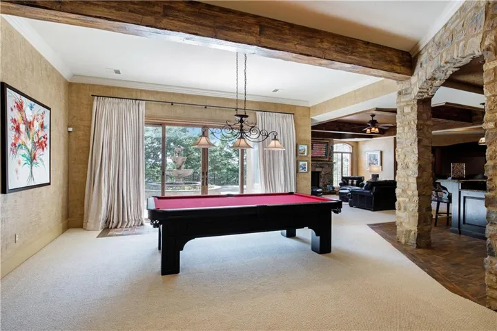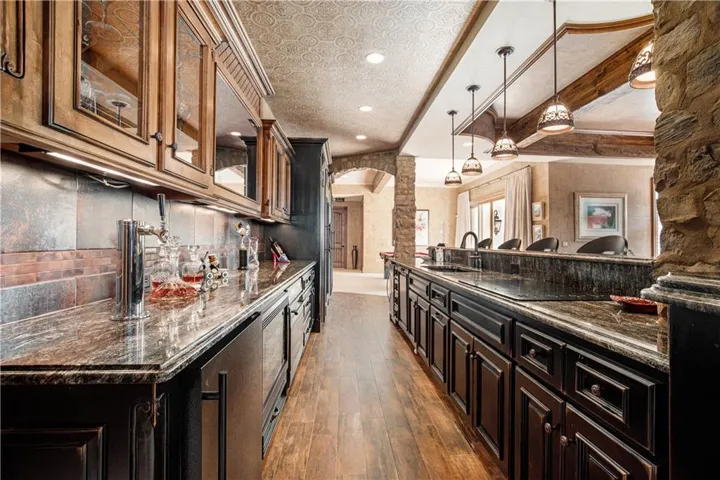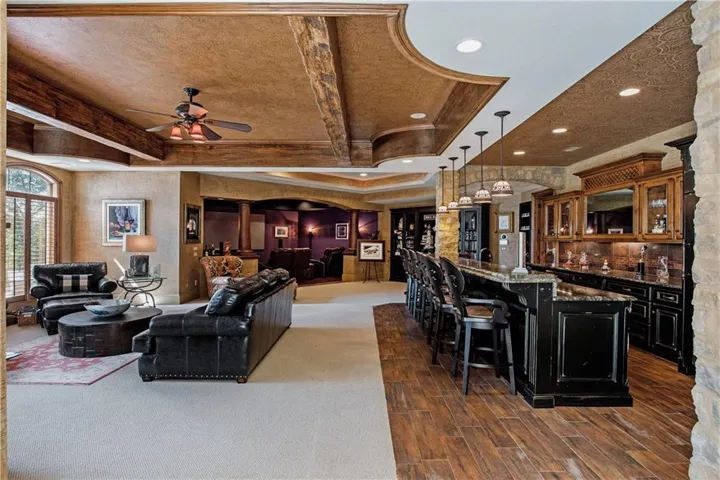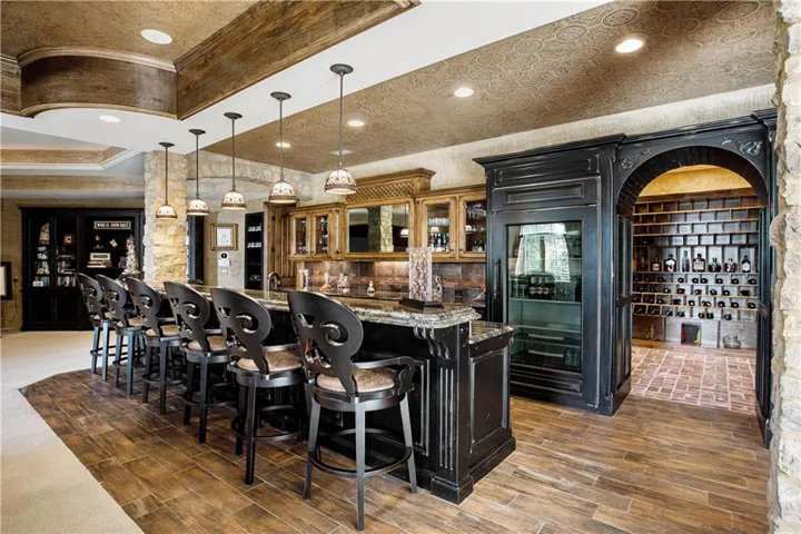 +"PublicRemarks": "Back on market NO FAULT OF SELLER. Inspections available upon request. Escape the monotony of white and grey and step into the warmth and comfort of this exquisite estate home, nestled amidst trees and complete privacy. You'll relish in the far-reaching views, breathtaking sunsets, and the serene privacy that envelops the property. The main level is tailored for effortless living, featuring a spacious primary suite, cozy office with a stone fireplace, formal dining & living rooms, generous hearth room, large breakfast room, mudroom w/ office, a guest bath, laundry room, and screened porch. The updated, expansive gourmet kitchen is a chef's paradise, boasting travertine floors, a large granite island w/ built-in steamer and vegetable trough sink, a warming drawer, a 48" Wolf Gas Range, double ovens, a Sub-Zero refrigerator and freezer, two dishwashers, and two walk-in pantries. Ascending the wide, curved staircase to the finished walkout lower level, you'll find a family room with a stone fireplace, beamed ceiling, pool table, and shuffleboard table. A state-of-the-art theater room, complete with a 120" projection TV, is perfect for movie nights. The expansive bar area is equipped for entertaining, featuring a large keg beer tap, Asko dishwasher, icemaker, Wolf stove, microwave, Sub-Zero beverage fridge, and a wine cooler. A custom wine cellar and tasting room with a brick floor provide ample storage for over 100 bottles, creating an impressive space for any wine enthusiast. The lower level also includes three large secondary bedrooms, each with en-suite baths, & a convenient second laundry hookup. A secure, alarmed room is discreetly located under the garage, offering a well-lit space for various needs. The newly expanded back patio is a private retreat, complete with a bar and hot tub, and the gently sloping backyard has room for a future pool. There's even space for a future elevator. Experience resort-like living in Cedar Creek. Buyer to verify square footage."