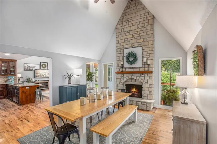 "LongDescription" => "Dining area with a fireplace and recessed lighting"