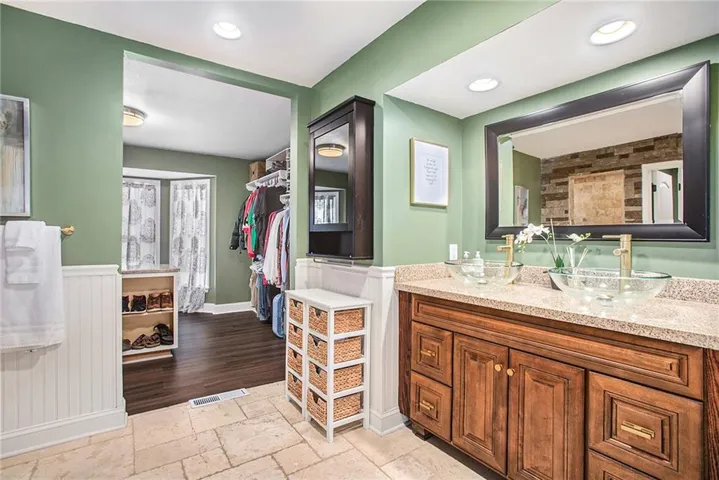 +"PublicRemarks": "Fantastic 1.5 story home in the heart of Olathe has some wonderful upgrades throughout. Desirable main level office, laundry and primary suite. Beautiful wood floors throughout main level. Remodeled kitchen has lots of cabinets, pantry, expansive granite counter tops with breakfast bar and stainless appliances. Beautiful living room with floor-to-ceiling windows brings in wonderful natural light. Floor-to-ceiling stone fireplace flanked by windows is the focal point of this living space. Main floor primary suite with wood floors has HUGE closet and spa-like bath with travertine tile floors and HUGE grotto shower. Convenient half bath and laundry room on kitchen side. Large secondary bedrooms on the second floor in addition to loft area great for study or play area. Newly finished lower level is ready for recreation and football fun, you even have room for a fitness area and storage. Newly stained oversized deck is wonderful outdoor entertaining space. Fresh paint on main level and in basement. Come by for a showing today. Priced Below JOCO Appraisal! Fantastic location to schools, shopping, restaurants and more!"