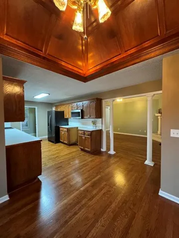+"PublicRemarks": "This home has so much to offer that you will need to see. Enter on the covered porch 13x14 then walk into a spacious great room with vaulted ceilings and fireplace as its focal point. Luxury vinyl plank goes throughout the majority of the home while hardwood floors can be found in the kitchen and dining area. Extremely generous counterspace/cabinets in the kitchen. A 6 1/2 ft pland ledge over the sink lets in tons of daylight. Countertops are 15ft long!!! Two pantries are located next to the kitchen in the laundry room. Laundry room actually has room to work with window for daylight. Tons of built-ins throughout this home. Off of the kitchen/dining area is access to the low deck so this makes it easy to use the deck. Only a couploe of steps to the ground. The dining room is spectacular with its wood vaulted ceiling. Together this is a ton of room to move about or entertain. The master suite is adorable. High ledges are perfect for decorating and a long window seat along the bank of windows, Skylights, Pillars seperate the corner whirlpool type tub. Double vanity. Seperate room for the shower and toilet. 7x4 walk-in closet. Bedroom 2 has a 10 x 41/2 loft along with vaulted ceilings. On the lower level or garage level you will find bedroom 4, spacious fam room with built-in wet bar area, walk-in cedar closet as well as a 5 1/2 ft closet, and half bath. New carpet downstairs and on the stairs. Fresh paint throughout the home. The back deck is approx 18ft deep so plenty of room for table and chairs. The corner lot is enclosed with a wooden privacy fence, This sets on the cul-de-sac on the side of the house. The garage is 25x24 feet so larger than most. Sellers truck fits in this garage."