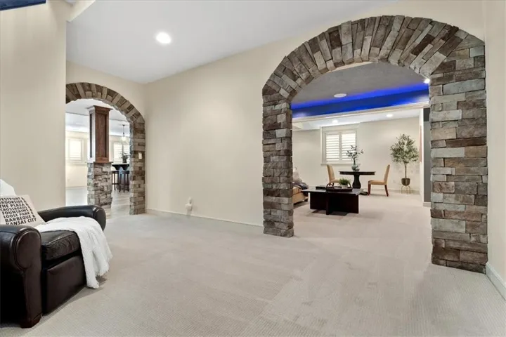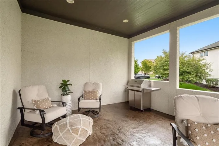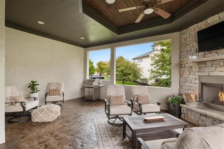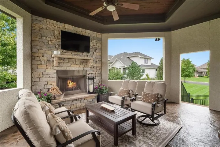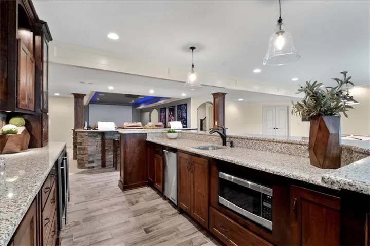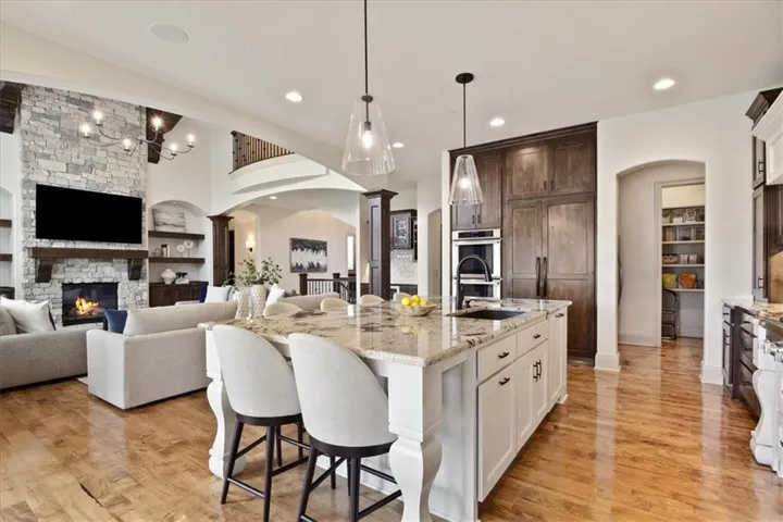 +"PublicRemarks": "Welcome to 11519 W 164th Terrace, an exquisite 5-bedroom, 5-bathroom custom-built masterpiece by Starr Homes, located in the prestigious Mill's Farm subdivision. Nestled on a spacious corner lot, this 6,119 sq ft home offers luxury and sophistication at every turn, starting with imported double iron doors, Thermador appliances, new carpet and paint, and a fully remodeled primary suite featuring a freestanding tub, dual vanities, and a walk-in shower. The main level captivates with its soaring ceilings, hardwood floors, exposed beams, and a striking stone fireplace, and two separate home offices. The gourmet kitchen boasts a granite island and countertops, custom cabinets with roll out spice racks, a walk-in pantry with garage access, and a wine cooler. The upper level offers three generously sized bedrooms, all with ensuite bathrooms and new carpet, plus a versatile bonus loft space. The finished lower level is an entertainer's paradise, complete with a home theater, custom wet bar, and ample space for recreation. Outdoors, enjoy the covered lanai with a 42" wood-burning fireplace, built-in speakers, and plenty of green space with room for a future pool. The oversized 3-car garage features epoxied floors, built-in cabinets, and convenient pantry access. Mill's Farm residents benefit from premium community amenities, including swimming pools, tennis courts, and a clubhouse. This remarkable home offers a perfect blend of luxury and convenience, don't miss the opportunity to make it yours!"