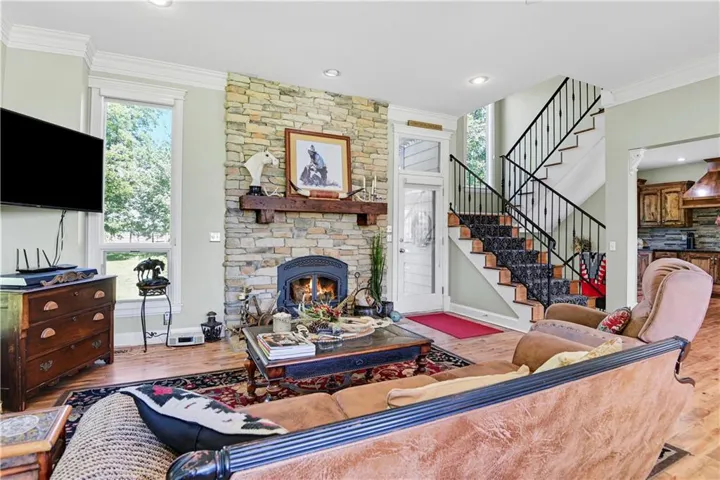 +"PublicRemarks": "DREAM EQUESTRIAN PROPERTY ON NEARLY 10 ACRES OF SERENE COUNTRYSIDE! The long welcoming driveway is complimented by beautiful tree filled landscape. Custom 9 stall horse barn, each with oversized runs, dutch and sliding doors. Barn includes wash bay, heated tack room and drinking post. Property is surrounded by steel pipe fencing and cross fenced with HorseGuard providing multiple pastures plus an 80 ft round pen for training. Inside the home the floor to ceiling windows and open floor plan are sure to impress inviting natural light from every angle. Refinished hardwood floors carry across the main level into the custom chef's kitchen equipped with large island, newer appliances and double pantry. 4 bedrooms upstairs including XL primary suite with walk in closet and oversized guest room with private balcony. The lower level is great for a game/theater room. GeoThermal HVAC system and Pella windows for high efficiency. Brand new roof and gutters! 4 car garage includes 3 front and 1 large attached behind for storage/yard equipment. Hurry to see this rare opportunity!"