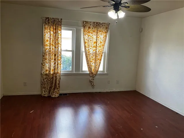 "LongDescription" => "Bedroom with a tray ceiling, a ceiling fan, and dark wood finished floors"