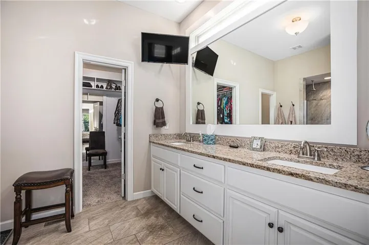 "LongDescription" => "Full bathroom featuring two vanities, suspended lighting, a walk in closet, a shower with shower door, and light tile patterned floors"