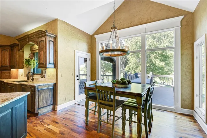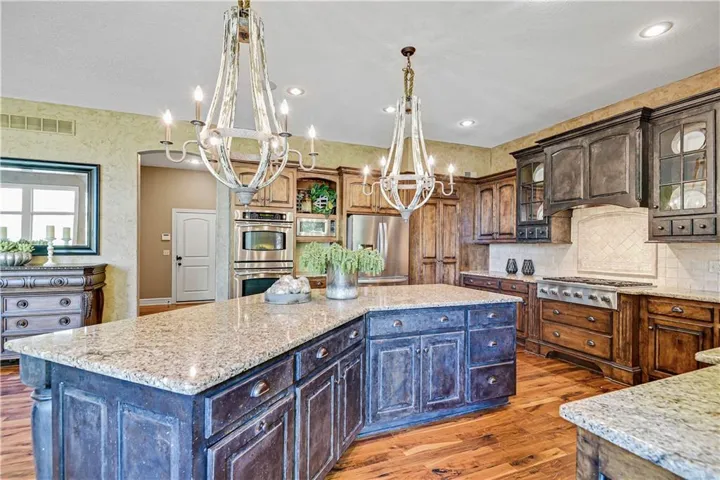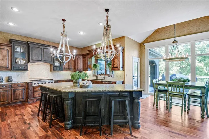 "LongDescription" => "Kitchen with stone tile floors, brown cabinets, black appliances, a chandelier, and pendant lighting"