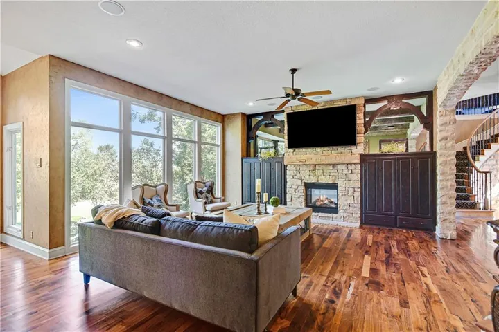 "LongDescription" => "Living room featuring wood-type flooring and a fireplace"