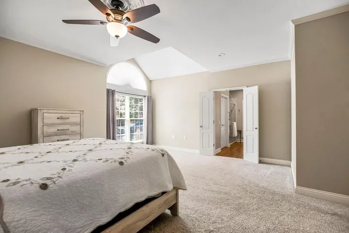 "LongDescription" => "Unfurnished living room featuring ceiling fan, light carpet, hanging lights, lofted ceiling, and arched walkways"