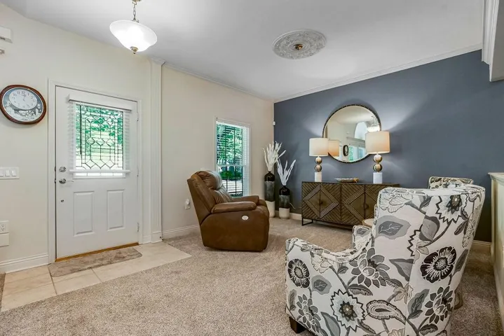 "LongDescription" => "Foyer with light colored carpet, a chandelier, ornamental molding, and light tile patterned floors"
