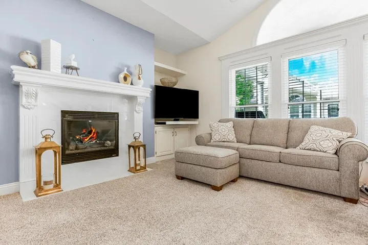 "LongDescription" => "Living area with ceiling fan, a fireplace, vaulted ceiling, built in features, and recessed lighting"