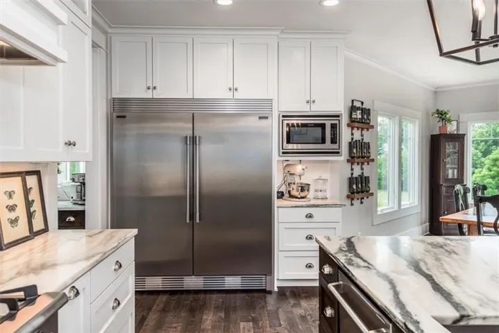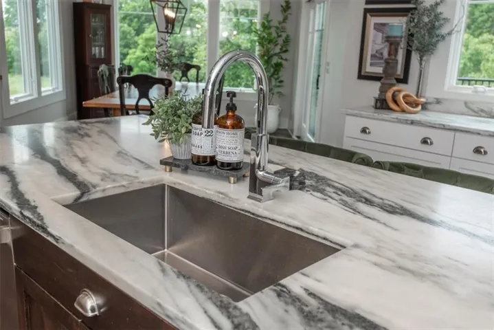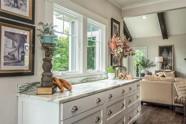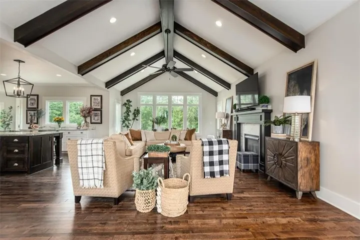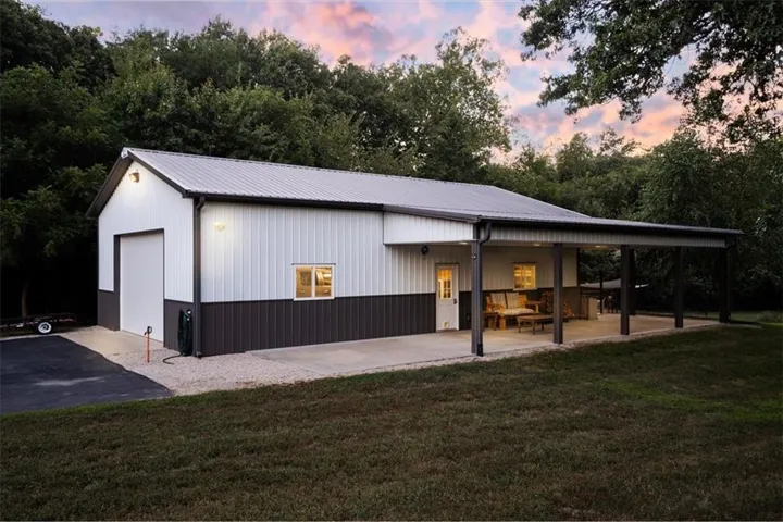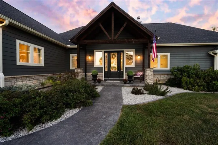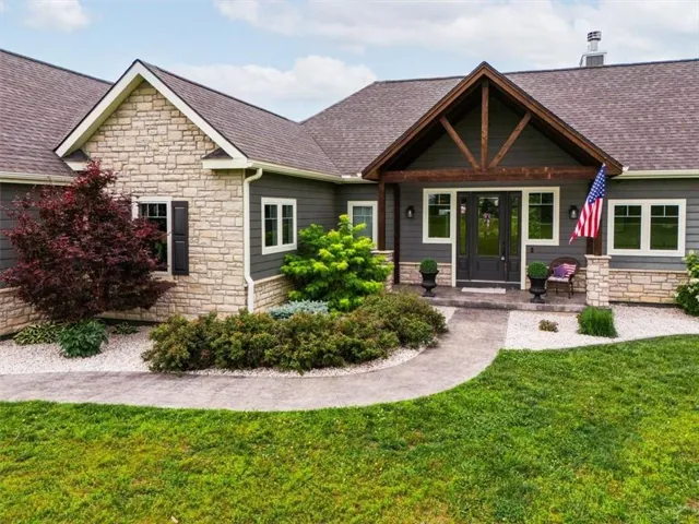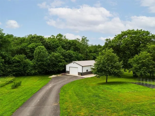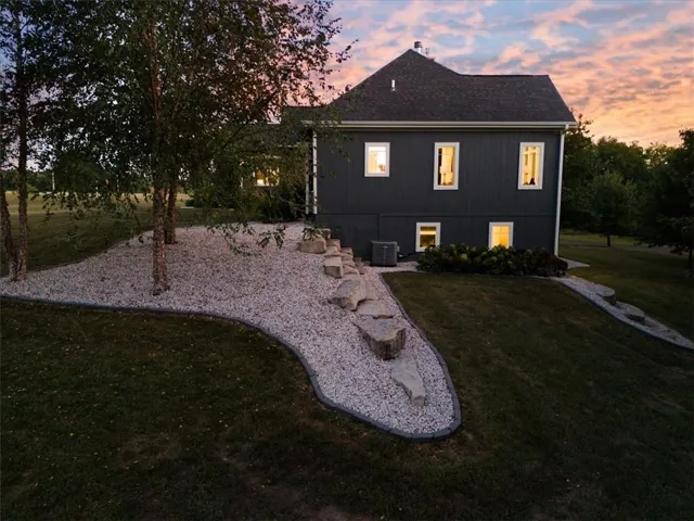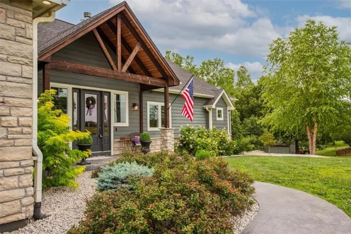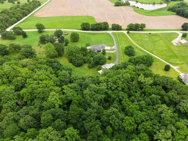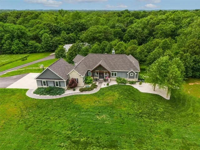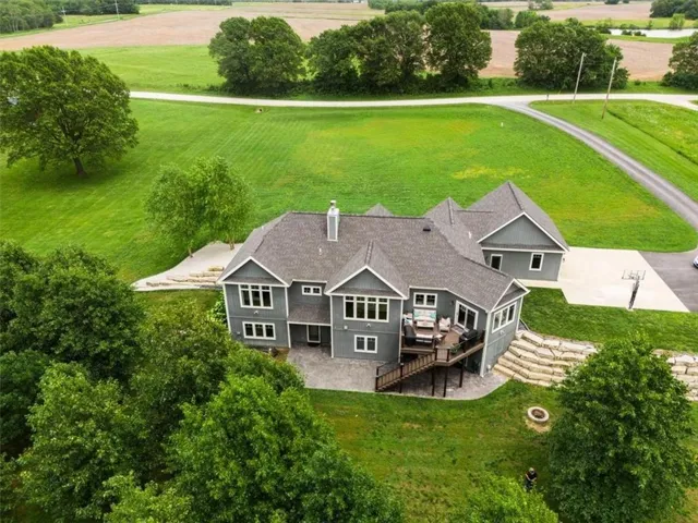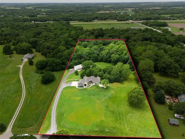 +"PublicRemarks": "Welcome to this stunning, custom built, main-level living home tucked away on 8ac of picturesque countryside. Step onto the grand entryway to be greeted w/ an open floorplan design, soaring vaulted ceilings w/ wood beams, surrounded by lg picture windows flooded w/ natural light & exceptional views! The main floor showcases luxurious & spacious living rm w/ gas fireplace, gourmet kitchen, office, primary bdrm, & laundry rm. The kitchen is a chef’s dream, featuring a 48” gas cooktop w/ 6 burners, gridle, pot filler, 48” vent hood, double ovens, super-sized built-in freezer & refrigerator, coffee bar/wine fridge, & walk-in pantry, not to mention the ample custom cabinets w/ marble countertops & large island for culinary space & seating for 4. The dining room provides an elegant space for hosting dinner parties w/ access to the beautiful deck, perfect for entertaining both indoors & out. The main floor office/bedroom is quietly tucked away from the entertainment area & serves as a 4th bedroom. Retreat to the private primary suite offering both comfort & relaxation, w/ large windows, spacious walk-in closet, & access into the double laundry area. The spa-like ensuite bathroom is complete w/ a walk-in shower, separate sinks, exceptional lighting, marble flooring & countertops. The basement level presents 2 spacious bedrooms, full bath, 2nd office/craft room, creating an ideal area for family members or guests. Cozy up to the wood burning fireplace while relaxing in the oversized family room, complete w/ extra table space for board games or dining. Basement walks out onto the partially covered, stamped concrete patio w/ views of treed backyard, surrounding hardscape, & shop. For those who love to entertain, explore, or retreat to a private & peaceful country lifestyle, this property has it all, while still being within reach of amenities & Hwy access w/ easy commutes to Baldwin, Panasonic Plant in DeSoto, KC, Lawrence, Ottawa & surrounding."