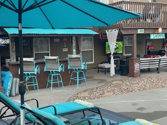 +"PublicRemarks": "Coveted Raintree Lake! Amazing Lake Life in KC/Lees Summit. This immaculate home is an entertaining paradise indoor and out. Well-appointed 3-bedroom, 2.5 bath with all bedrooms on the main level. Primary bedroom is secluded with a walkout balcony overlooking your resort style pool! Well-appointed kitchen with beautiful glass display cabinets, kitchen island, eat in area that leads out to your walkout-deck. Just off the kitchen is your office with beautiful woodworking and cabinetry. The lower level boasts an impressive media area with a 120-inch Projection T.V./ Surround Sound, Wet bar, 1 wine fridge, 1 beverage fridge, granite counter tops and deep sink. ** Bonus Wine Cellar**. As you walk out to your back yard you are going to feel like you've walked into your own private Oasis. Incredible blue bottomed sport pool with Tiki Bar, lush landscaping with led lighting, palm tree, new 20x15 Trex Sun Pad with 3 chaise loungers, covered outdoor living room with T.V., and grilling/pizza oven area. The landscaping and lighting are unbelievable! Fenced garden area as well. Raintree Lake is "Lake Life" at its finest. Full use of Lake privileges includes incredible fishing, wave-running, skiing, wakeboarding with most boats allowed on our water. Raintree offers an amazing Olympic size Pool with waterslide, Clubhouse, Playground and miles of lakeside trails for hiking, running or biking. HOA is one of the lowest in our area with all amenities included."