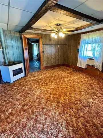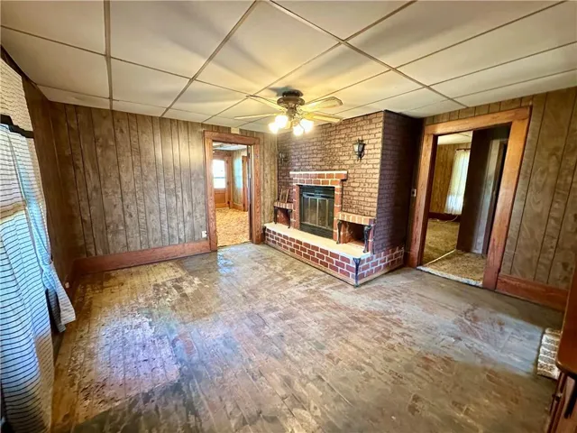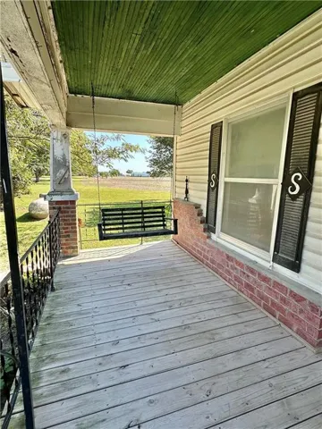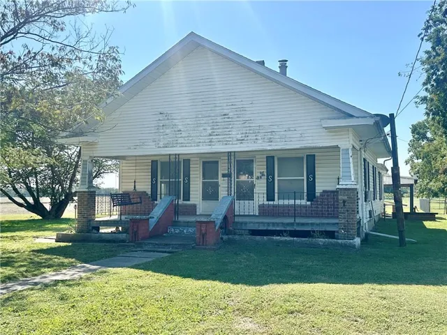 +"PublicRemarks": "Location, Location, Location!! 2 BD, 2 BA home on 4.4 m/l acres, majority of the acreage is currently crop ground. You will love sitting on your covered front porch every morning & evening. From the front door, you enter into the living room. To the left is a bedroom with it's own outside access. The master bedroom & bathroom is on the other side of this bedroom. The family room, or this could be a formal dining room, features a fireplace and hardwood floors that would be beautiful refinished. There's a full bathroom off this room. The kitchen has a nice pantry & built ins. The laundry room is off the kitchen area. Unfinished basement. Storage sheds. Carport. Covered back patio. Vinyl siding."