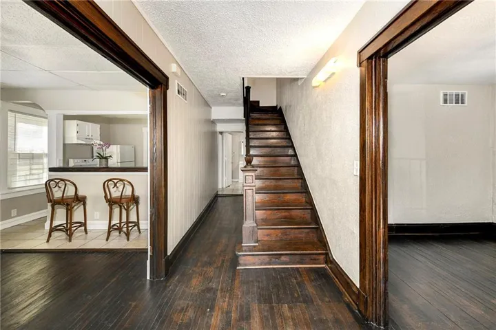 +"PublicRemarks": "Spaciously satisfying 5 bedroom home has a newly painted interior and exterior plus refinished wood floors! Kitchen with breakfast bar is open to a dining space. Convenient main level laundry with pantry storage off the kitchen. One Bedroom plus a full bathroom with shower are located on the first floor. A charming vintage staircase leads to four bedrooms and a 2nd full bathroom upstairs. Replacement windows add to energy efficiency. Small garage area is at the basement level. Fenced backyard. A home designed for great living."