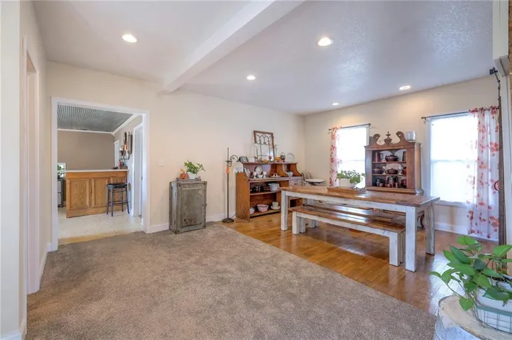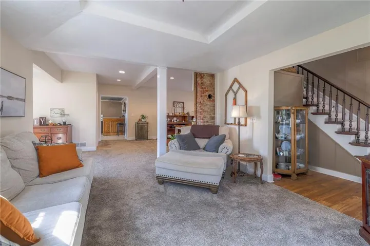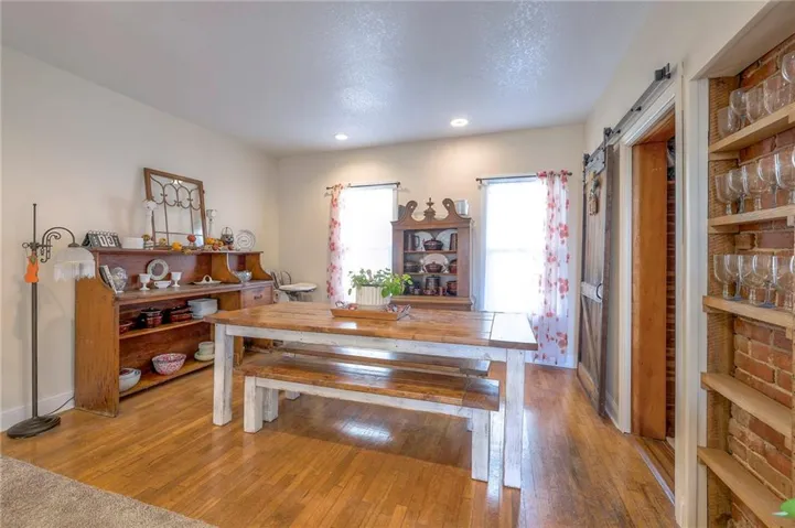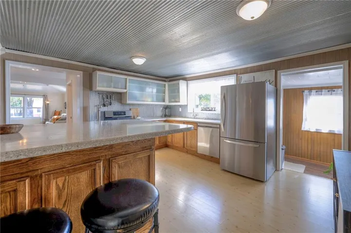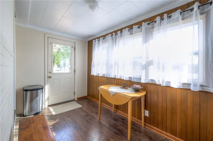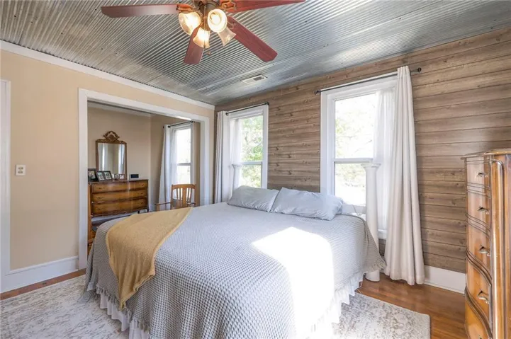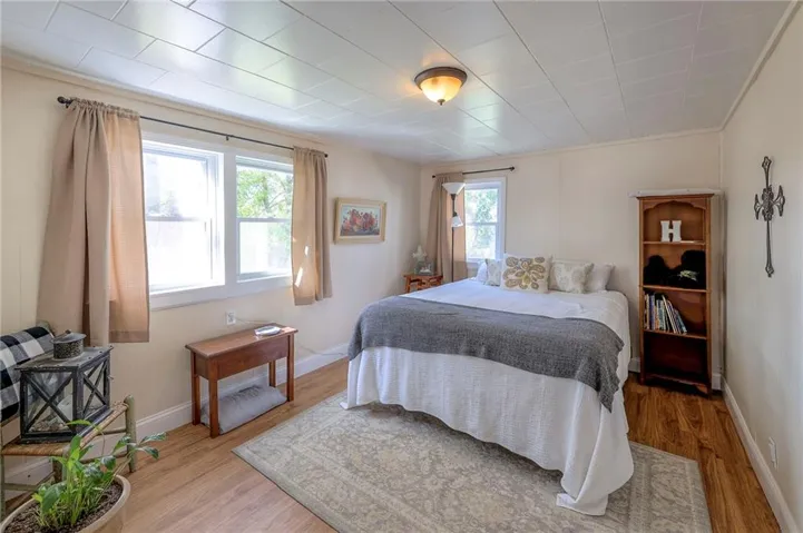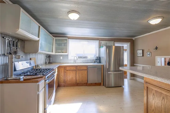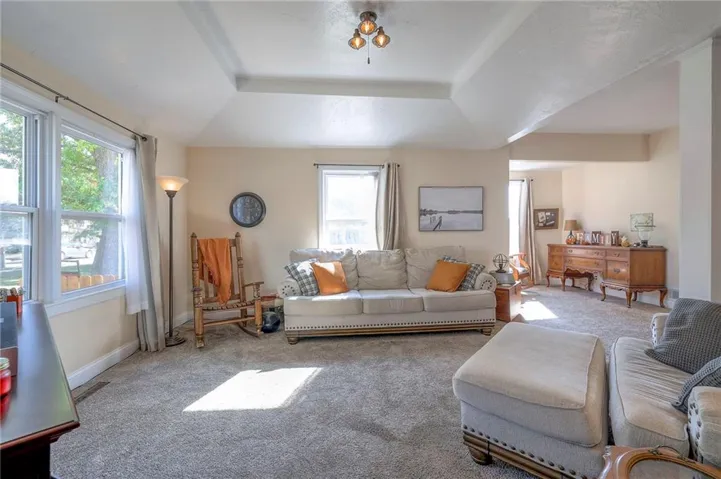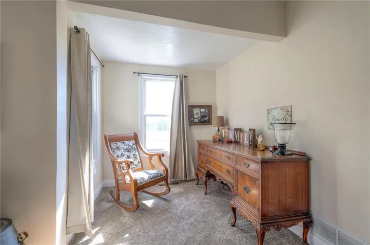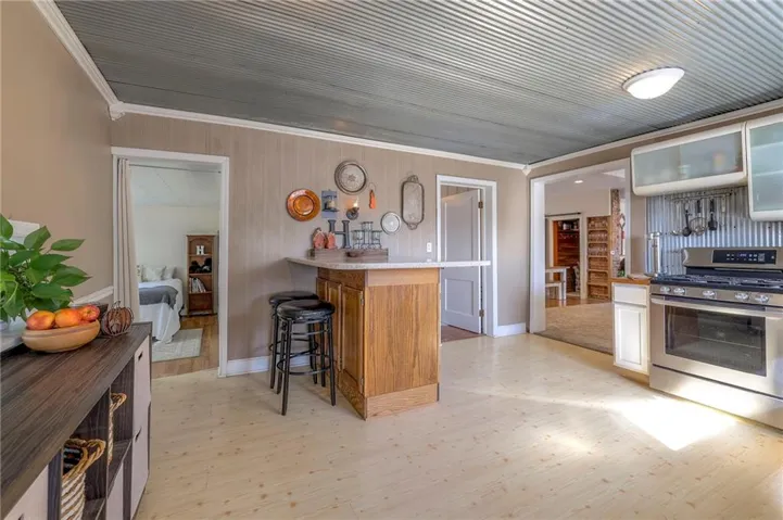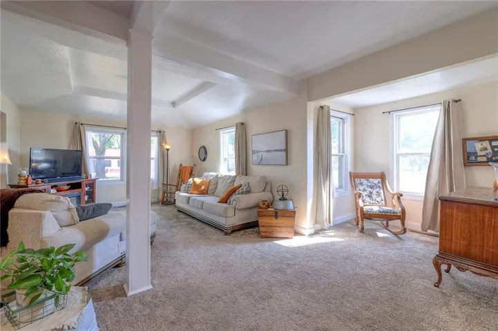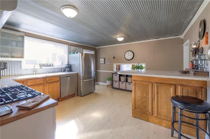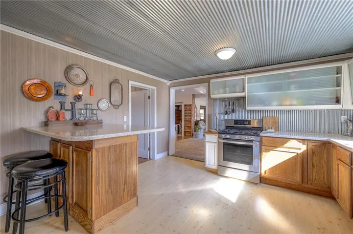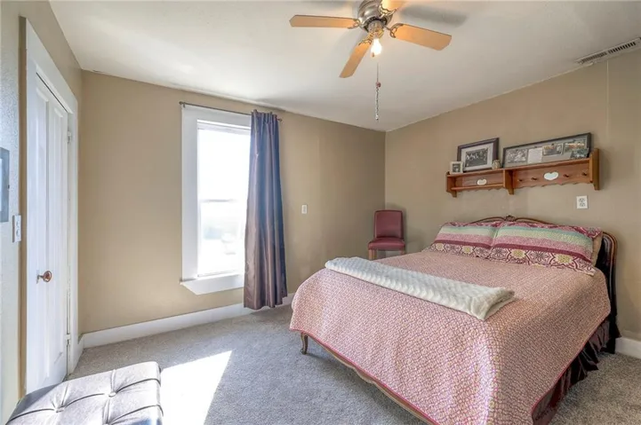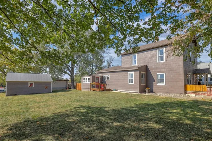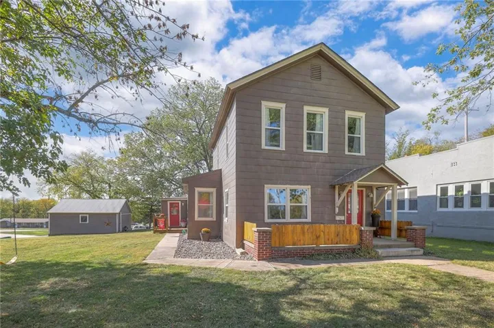 +"PublicRemarks": "This well maintained 1.5 story is full of charm and character! A quaint, covered porch greets you upon arrival. Upon entering beautiful hardwood floors and bright light welcome you inside. The main level is both comfortable and functional providing plenty of space to meet all of your needs. The large living room flows seamlessly into the dining area with beautiful floors. The kitchen is large with granite countertops, a tin ceiling, large kitchen island and BRAND NEW stove, refrigerator and dishwasher! Kitchen provides convenient access to the sun room. Enjoy your morning coffee and watch the leaves on the established trees change colors right in front of you. Main floor living at its finest with a large bedroom, full bath, and generous sized laundry room. A bonus room that could be used as an exercise room, office, or additional bedroom truly makes this home one level living! Upstairs the primary bedroom is large with a sitting area and beautiful hardwood floors. Another bedroom and full bath complete this level. Sit on either of the two decks that overlook the treed covered lot and enjoy the beautiful fall colors! HVAC is 5 years new! Fantastic location near Wallace Park, Paola Family Pool, and ball fields. Welcome Home! Taxes and SqFt per county record. Room sizes approx. No preferences or limitations or discrimination because of any of the protected classes under Fair Housing."