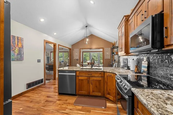 +"PublicRemarks": "Looking for a maintenance provided home with main-level living in a premier location? Welcome to this stunning 3 bed, 3 bath, maintenance provided home in the St. James Court subdivision. This entire home has undergone a complete remodel with an extensive list of high-end upgrades and finishes including new floors, carpet, paint, trim, and so much more. The attention to detail in this home is unmatched! The first level features a primary bedroom with an oversized on-suite bathroom and walk-in closet, a second bedroom / office, second full bathroom, sun room / den, large living area, kitchen, mudroom, and laundry. The kitchen features beautiful wood cabinets, granite countertops, new smart appliances, soft-close drawers, pull out shelves, and much more. This home has one gas fireplace, and two electric fireplaces. In the basement you will find your third bedroom and full bath, a full living area with a coffee bar, an over-sized bonus room, and ample storage space. HOA includes outdoor maintenance, snow removal, lawn care, sprinklers, community pool, clubhouse, exercise room, and walking trails throughout the community. This property has a large front yard with an attached 2 car garage. Don't miss out!"