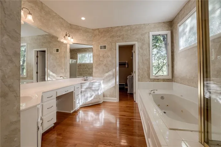 This stately 1.5 story is situated on a .66 acre lot on a cul de sac & backs to green space. A light-filled Foyer greets you with access to the Formal Dining Room & Great Room. The Great Room has soaring 18' ceilings, a fireplace, & a wall of windows to bring the outside in. The Kitchen features an island, a peninsula with bar seating, & granite countertops. There is a large dining area with skylights featuring a custom stained glass overlay. The Hearth Room has a stone fireplace that makes the space feel cozy & comfortable. The Primary Suite on the main has 12' vaulted ceilings. The Master Bath features a dual sink vanity, a jetted tub, & a separate shower. Walk up the curved staircase to the 2nd-floor & an open Loft & catwalk. The dedicated Guest Room features a private bath a large walk in closet. A Hollywood Bath connects the 3rd & 4th Bedrooms.\r\n