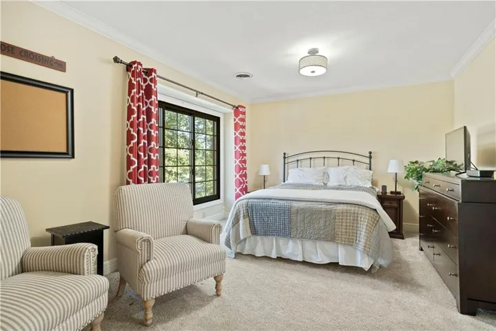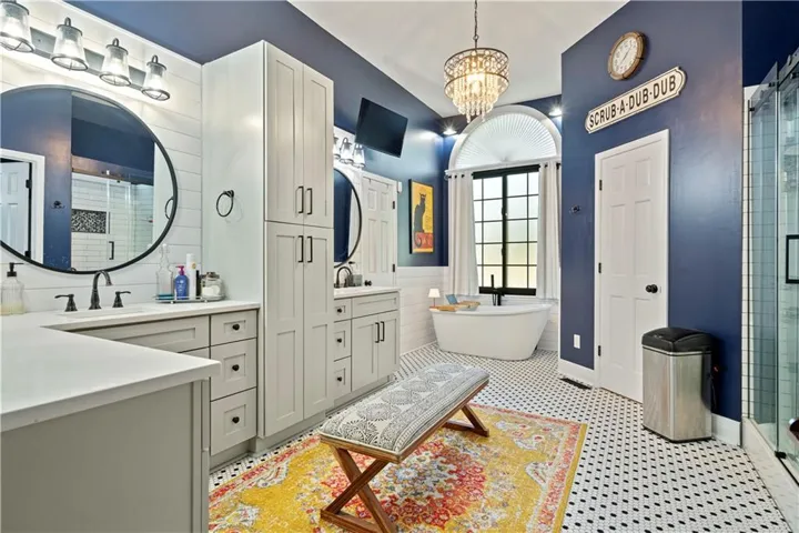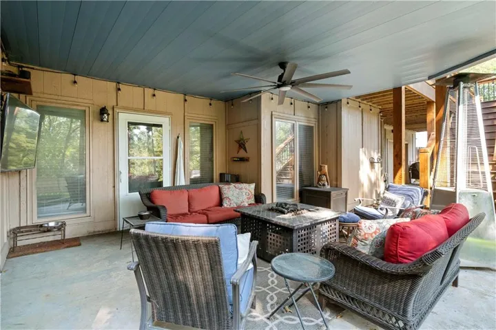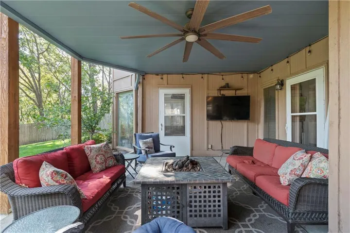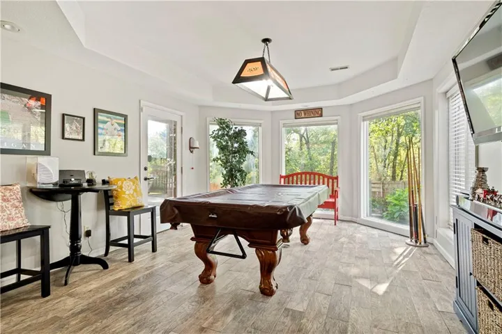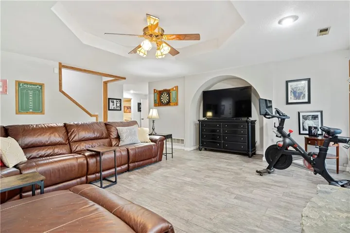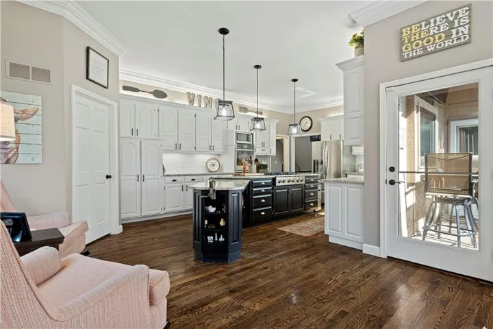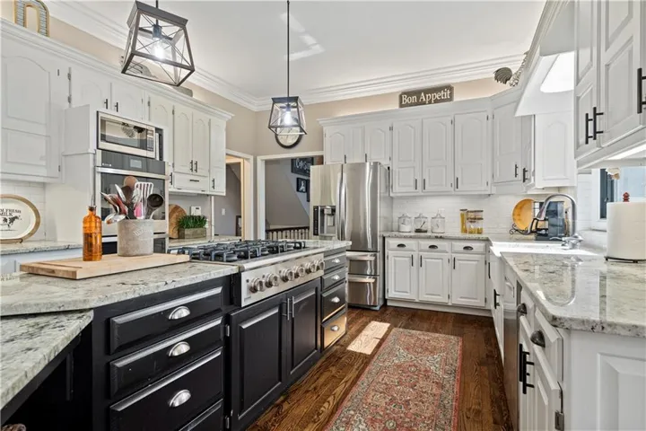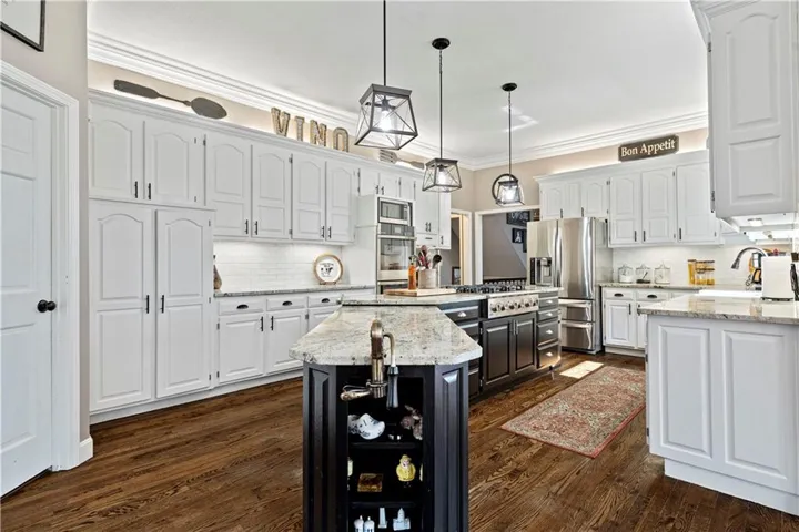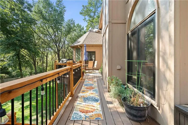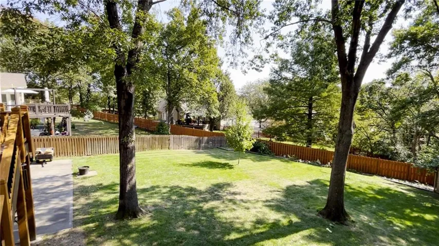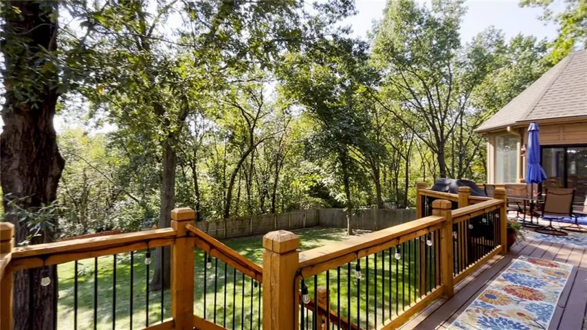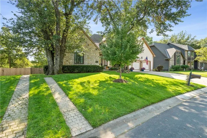 +"PublicRemarks": "Fabulous updated home in a beautiful setting on a private, gated street with so much to offer! Step inside and you'll fall in love! Spacious great room with large windows and fireplace, formal dining room, and the kitchen is a chef's dream! Beautiful white cabinets, granite counters, gas cooktop, double ovens, farmhouse sink and an abundance of cabinets plus an extra long island! The sitting area makes for a cozy setting and the large breakfast room is surrounded by full windows bringing in the outdoors. The main floor primary bedroom and bath are very spacious! Gorgeous bath features double sinks and make-up vanity w/ quartz counters, lots of cabinet storage, stand-alone garden tub, his/her walk-in closets and mounted TV. Walk out from the primary bedroom and enjoy the deck which connects to the main deck off kitchen & great room. Half bath and laundry room on main level. Beautiful hardwood floors in great rm/kitchen/dining rm. Nice crown molding and trim work throughout! Upstairs features three spacious bedrooms and two baths. All bedrooms have direct bath access and great closet space! The walk-out basement is amazing w/ an abundance of windows!! Large family room with stone fireplace, bar area w/ fridge/sink and game area w/ pool table and TV that stays! There's also a non-conforming 5th bedroom, full bath, cedar closet and storage room! The 3rd garage/workshop is great for all your hobbies and projects! Plenty of workspace and cabinets w/ full garage door to park your lawnmower or collector car with concrete drive from double gate. The outdoor living spaces are so inviting!! Enjoy watching football outdoors w/ the mounted TVs in both the deck and patio below that overlook the beautiful fenced yard and feels so private w/ views of greenspace. Highly-rated Blue Springs schools! Updates include: HVAC-upper & lower, deck replacement, gutters and guards, windows, kitchen, primary bath, and more! Location is perfect for quick highway access, shopping and restaurants."
