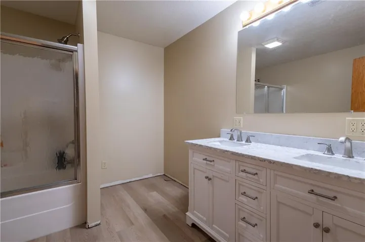 "LongDescription" => "Bathroom with a textured wall, vanity, a textured ceiling, shower / tub combo, and light floors"