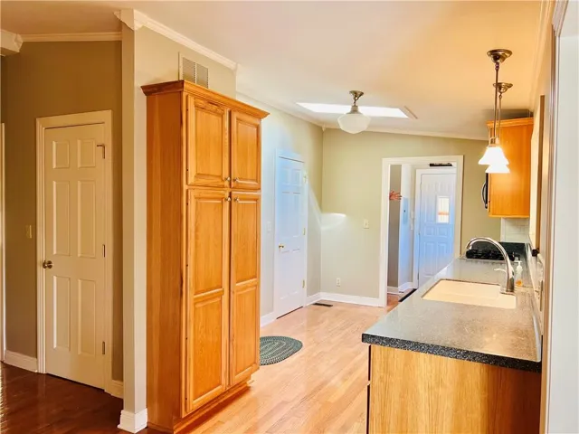 One-level living, with a great finished basement! Recently updated kitchen, with a pantry and laundry room adjacent. Large primary bedroom and ensuite bathroom, with a HUGE walk-in closet, and custom closet system! Primary shower has an advanced shower system, not just a shower head! Wonderful entertaining space in the basement with surround sound, with a bar. 3rd bedroom in the basement with a full bathroom; shower is large and has 2 shower heads! 2nd laundry facility in the basement, plus a storage room that could be considered a safe room! Main garage has an acrylic floor. Utility garage in the back basement level for storage of yard equipment. Beautiful outdoor features, with a patio close to the house, built-in grill, and another peaceful gathering area just 30 or so feet from the home. Lawn equipment can be stored in an additional small garage space in the back.\r\n