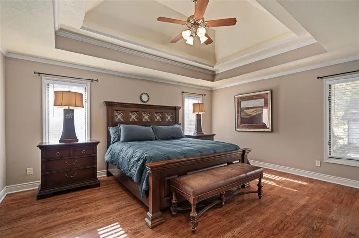 "LongDescription" => "Bedroom with ornamental molding and wood-type flooring"
