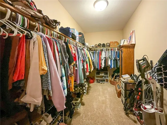 Master suite with walk in closet and full bathroom featuring a double vanity, lots of storage, tiled floors and walk in shower.\r\n