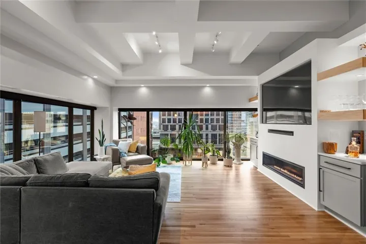 +"PublicRemarks": "Fall in love with this south-facing corner unit in Wallstreet Tower! The spacious Fifth Avenue floor plan is an entertainer's dream full of updates, including recently refinished floors, an updated kitchen with quartz countertops, and a custom-designed fireplace with accent lighting. All appliances are newer (4 years), the HVAC system is 4 years new, and the windows feature electric smart control blinds to provide privacy and energy efficiency. This condo features two spacious en-suite bedrooms, one with brand-new hardwood floors and a custom-designed bathroom with a walk-in shower. The primary en-suite features plush carpet, a huge walk-in closet, and a large bathroom with a walk-in shower and separate tub. Enjoy all the luxury of living in this downtown condo with 24-hour security/concierge, 24-hour fitness center, club room, pub room, and rooftop pool. This condo also includes two designated parking spaces and a designated storage locker. Plus, there is a 50% tax abatement through 2029!"
