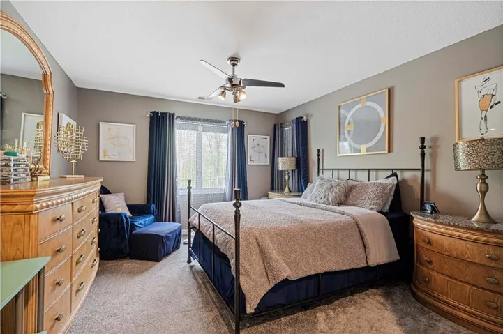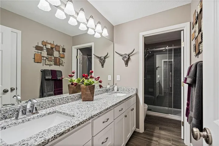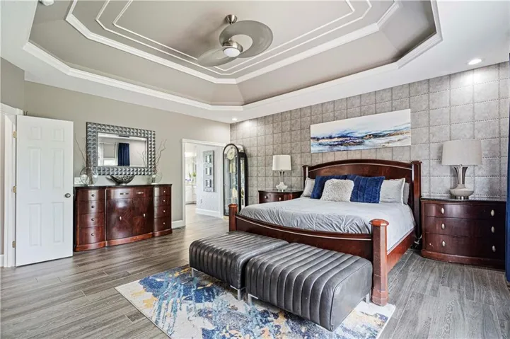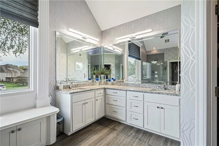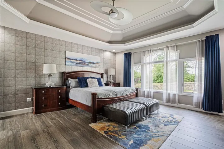 The primary suite, located on the main level, serves as a luxurious retreat with a tray ceiling, large windows, and a spacious en-suite bathroom. The bath boasts dual vanities, granite counters, a glass-enclosed rain shower, creating a spa-like experience. The double walk-in closet offers ample storage with custom shelving. \r\n