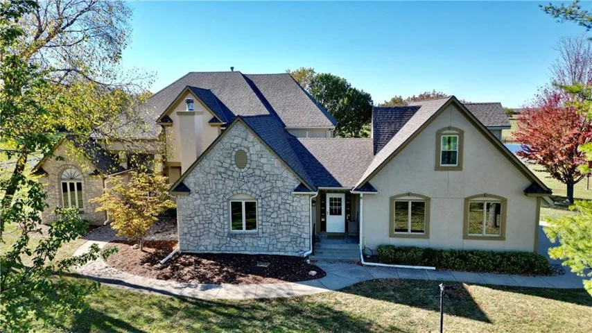"LongDescription" => "Prairie-style home with stone siding, driveway, a garage, stucco siding, and a shingled roof"