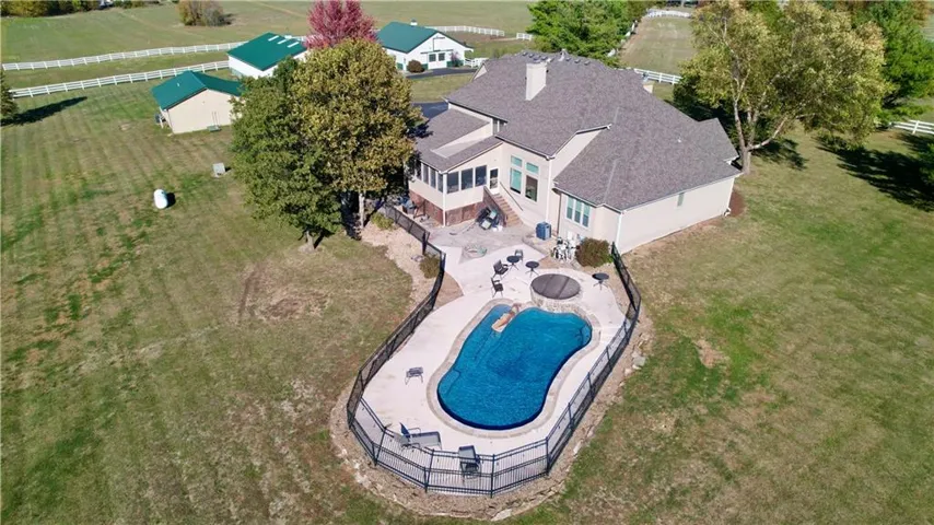 +"PublicRemarks": "Secluded 40 Acre estate nestled privately and surrounded by trees boasts a 5 Bedroom 6000+ sq ft 1.5 story home along with a 3 Bedroom Guest House, Storage/shop barn and a second horse/livestock barn with a custom fitness room built in. White PVC fencing surrounds the property with plenty of Sheds. Beautiful private driving leading up to the large home. Gorgeous views in every direction. From the main house, sit on the back deck and watch the sun set over the large pond and gorgeous siren fields. Gourmet kitchen with granite counter tops, 2 large living rooms, dinning room, library for privacy, separate balcony den studying area. Loads of space in the home with so many areas for relaxation. Beautiful pool and hot tub to enjoy the summer evenings. (Professional pictures of interior coming soon)"