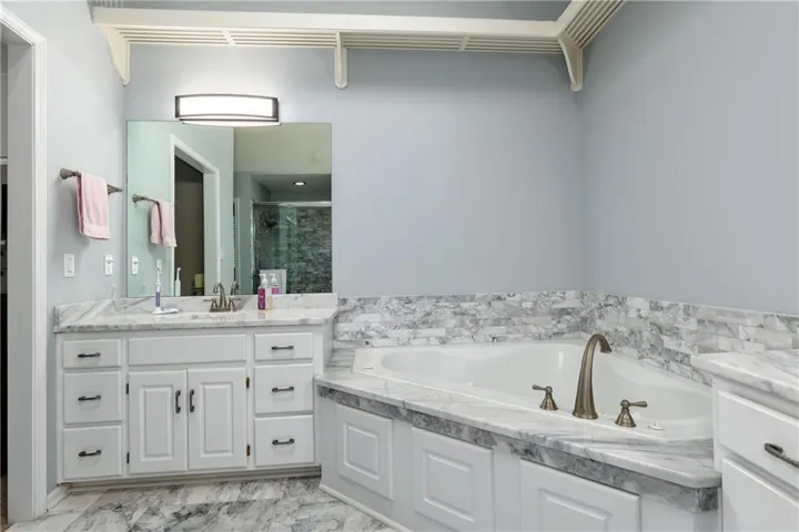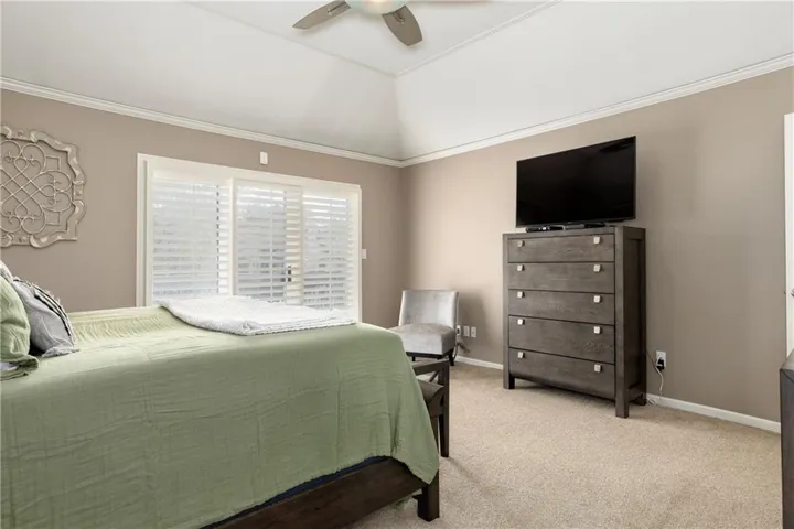 This very open floor plan is located on a quiet Cul-de-sac with beautiful views of the creek. Spacious white kitchen with granite counters, SS appliances and a cozy breakfast area featuring a gas log fireplace. Oversized dining room and great room with a fireplace and wet bar. The owners suite offers high ceilings, plantation shutters and deck access.\r\n