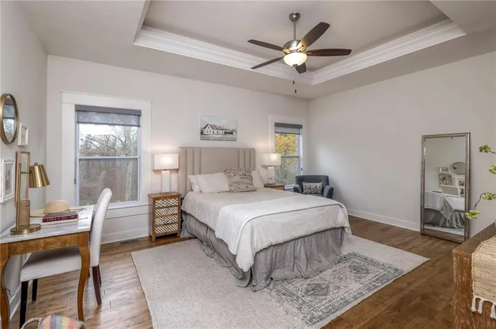 "LongDescription" => "Bedroom featuring carpet, a ceiling fan, ensuite bathroom, ornamental molding, and a raised ceiling"