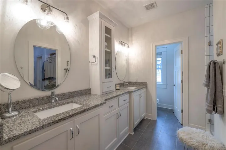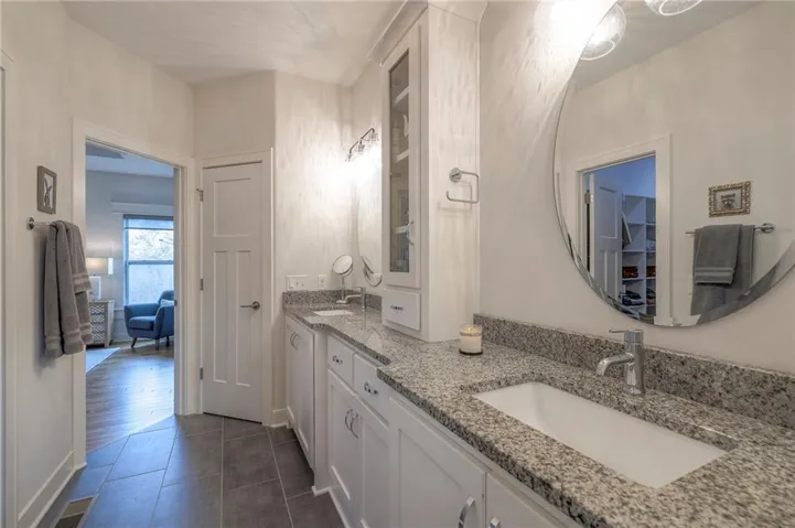 "LongDescription" => "Bathroom with a stall shower, double vanity, and light tile patterned floors"