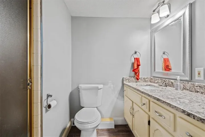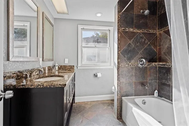 "LongDescription" => "Bathroom with a textured wall, vanity, a textured ceiling, shower / tub combo, and light floors"