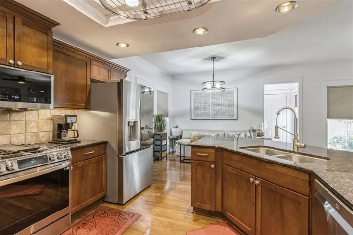 +"PublicRemarks": "A Must See! Move-in ready 4-bedrooms, 2.5-bathrooms , 2 car-garage and 2 add'l parking spaces, 2-story home perfectly situated in a peaceful neighborhood with an exclusive view of a community-owned pocket park. The lush, well-landscaped grounds are a true gardener's dream, filled with vibrant perennials that will bloom year after year. Relax on the front porch with views of the park or unwind in the inviting back patio area, perfect for entertaining or quiet evenings at home. Inside, you'll find a formal dining and living room, an inviting, great-room with fireplace, and breakfast nook. Gorgeous hardwood floors and gleaming granite countertops add elegance throughout. The chef in the family will love the spacious kitchen with SS smart LG appliances, abundant cabinetry, and a sleek breakfast bar. The primary suite features a walk-in closet, spa-like bathroom with jetted tub, separate shower, new quartz countertops and more, making it the perfect place to relax and rejuvenate. SMART Features includes: Smart garage door opener, thermostat, and in-ground sprinkler system. The water softener and water heater have also been upgraded for efficiency, comfort, and convenience. The fully fenced-in backyard is a tranquil haven featuring a stamped patio, garden beds, and a fire pit for cheerful gatherings. Need storage? This home has it! A massive "crouch space" crawl space with a 5-foot clearance, an attic, and a spacious garage provide all the room you'll need. Prime Location - This home is ideally located within walking distance of community pocket parks, Macken Park, North Kansas City High School, trendy downtown North Kansas City, and Waggin' Trail dog park. Close to shopping, Enjoy easy access to downtown (less than 10 minutes) and the airport (about 15 min away). This home offers the perfect combination of luxury, comfort, and convenience – Don't miss your chance to make this stunning property your own. Schedule a tour today!"